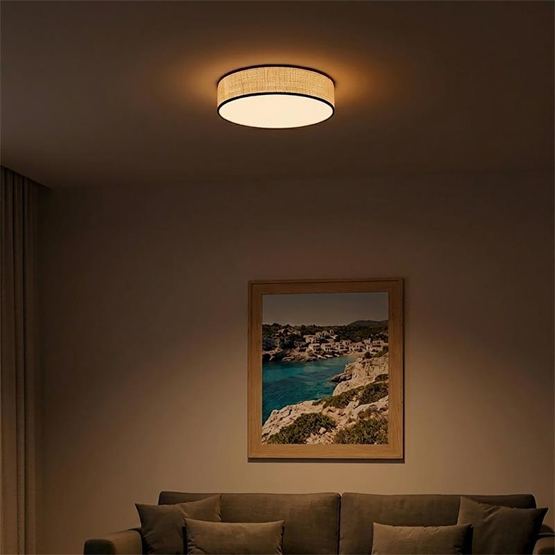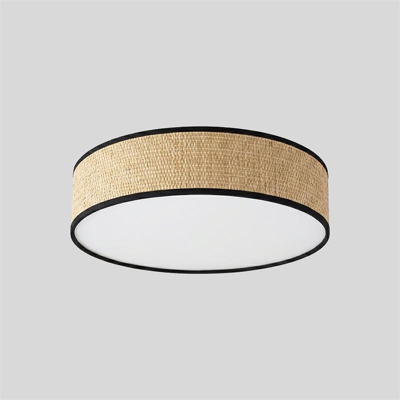 Serie ENZO II. Fabricado en rafia en color marrón. ,pvc blanco , . Para su funcionamiento requiere 2 bombilla con casquillo E27. (bombillas no incluidas en la caja) .Apta para bombillas de tecnología Led cuya potencia máxima admitida por casquillo es de 15W. Con unas dimensiones de 40cm ancho por 40cm de profundo y 12cm de alto y un peso real aproximado de 560 gramos.Muy fácil de limpiar con una gamuza humedecida en agua y jabón neutro, te recomendamos que evites el uso de productos químicos que puedan dañarla.