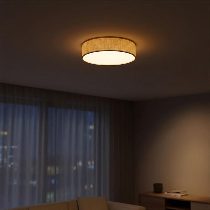 Serie ENZO II. Fabricado en yute en color saco ,pvc blanco , . Para su funcionamiento requiere 2 bombilla con casquillo E27. (bombillas no incluidas en la caja) .Apta para bombillas de tecnología Led cuya potencia máxima admitida por casquillo es de 15W. Con unas dimensiones de 30cm ancho por 30cm de profundo y 11cm de alto y un peso real aproximado de 460 gramos.Muy fácil de limpiar con una gamuza humedecida en agua y jabón neutro, te recomendamos que evites el uso de productos químicos que puedan dañarla.