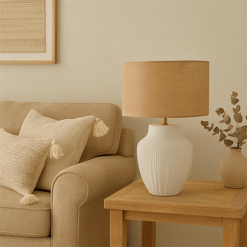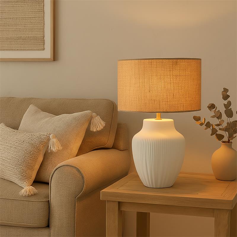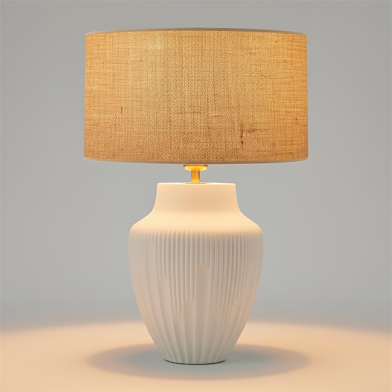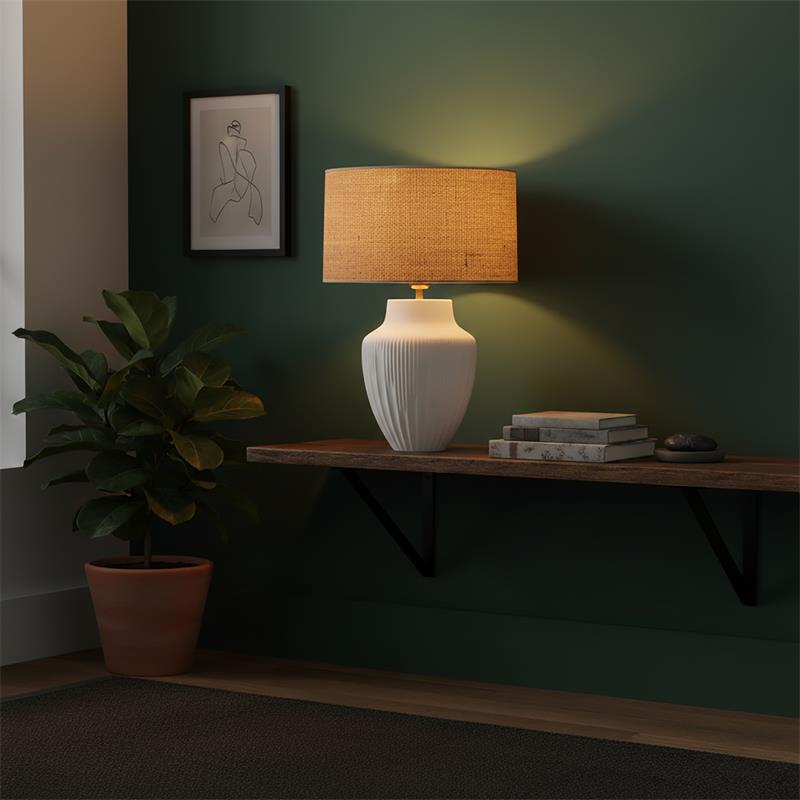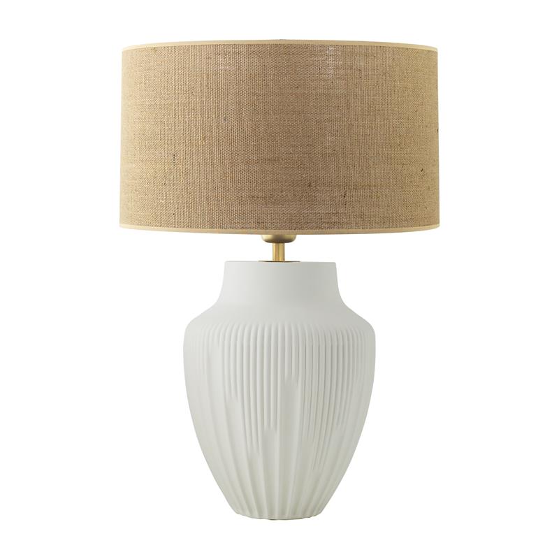 Serie MELISA. Fabricado en cerámica en color blanco ,yute natural ,cable pvc blanco. Para su funcionamiento requiere 1 bombilla con casquillo E27. (bombillas no incluidas en la caja) .Apta para bombillas de tecnología Led cuya potencia máxima admitida por casquillo es de 15W. Con unas dimensiones de 30cm ancho por 30cm de profundo y 46cm de alto y un peso real aproximado de 1490 gramos.Muy fácil de limpiar con una gamuza humedecida en agua y jabón neutro, te recomendamos que evites el uso de productos químicos que puedan dañarla.