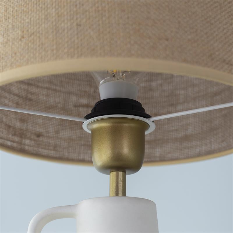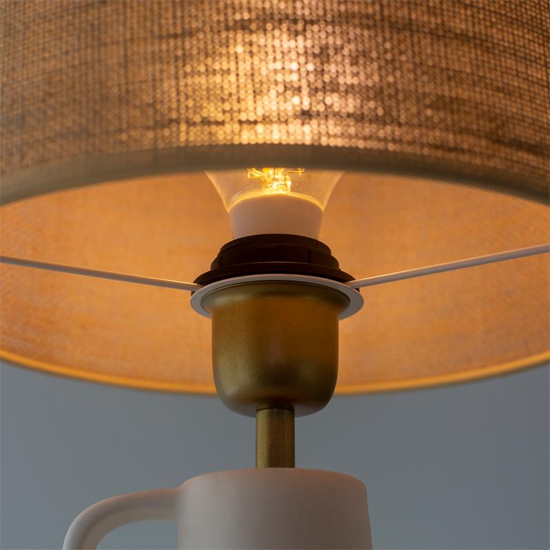 Serie ELVIRA. Fabricado en cerámica en color blanco ,yute natural ,cable pvc blanco. Para su funcionamiento requiere 1 bombilla con casquillo E27. (bombillas no incluidas en la caja) .Apta para bombillas de tecnología Led cuya potencia máxima admitida por casquillo es de 15W. Con unas dimensiones de 25cm ancho por 25cm de profundo y 45cm de alto y un peso real aproximado de 1380 gramos.Muy fácil de limpiar con una gamuza humedecida en agua y jabón neutro, te recomendamos que evites el uso de productos químicos que puedan dañarla.