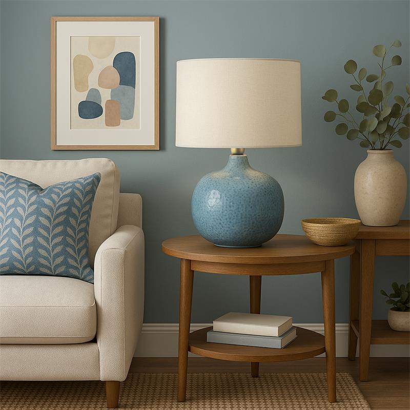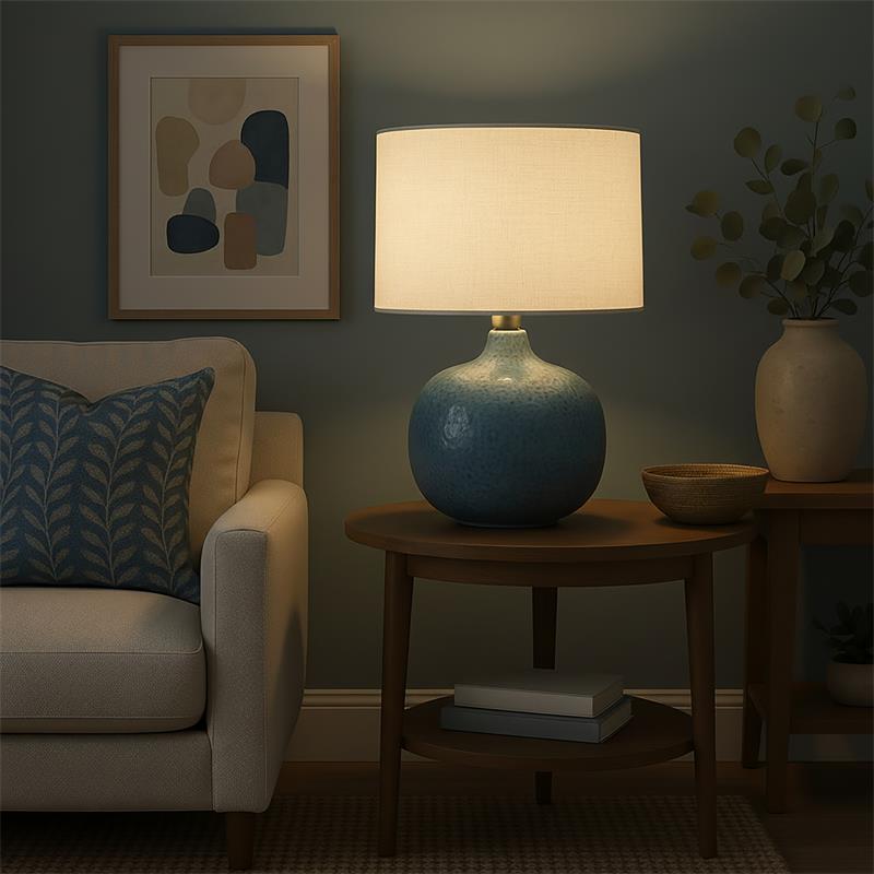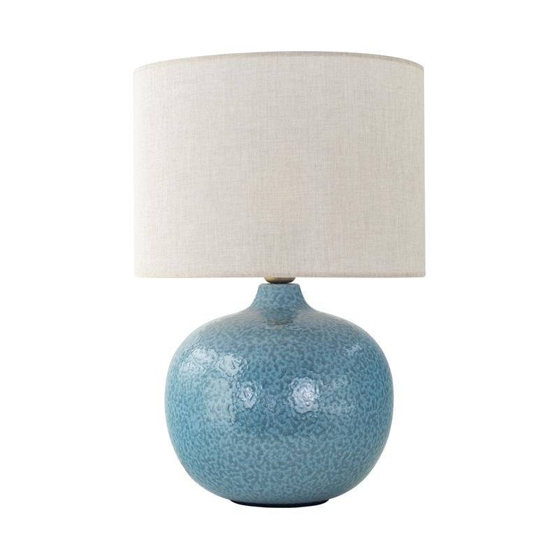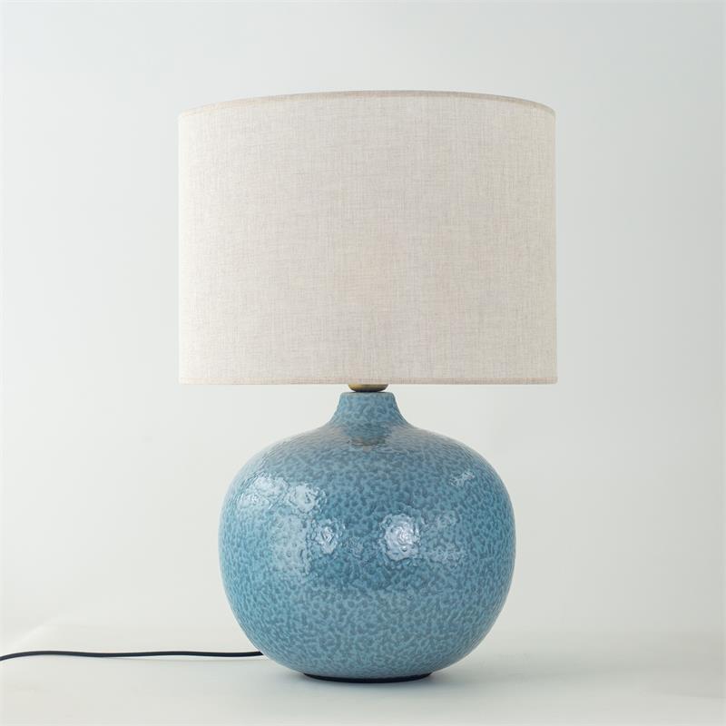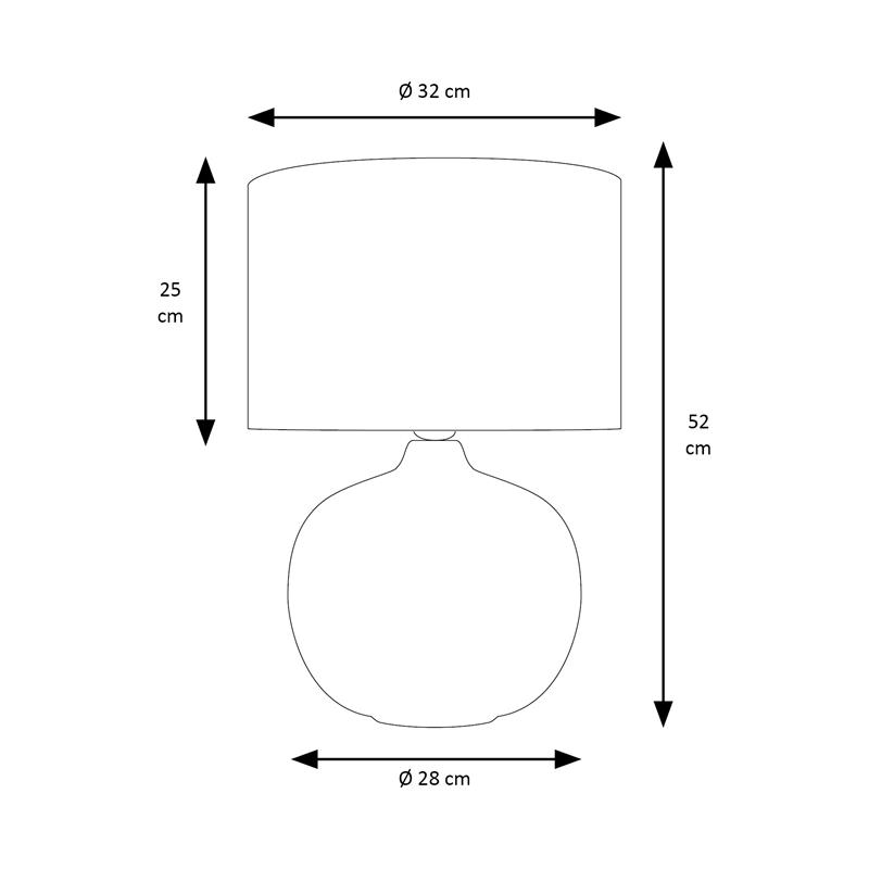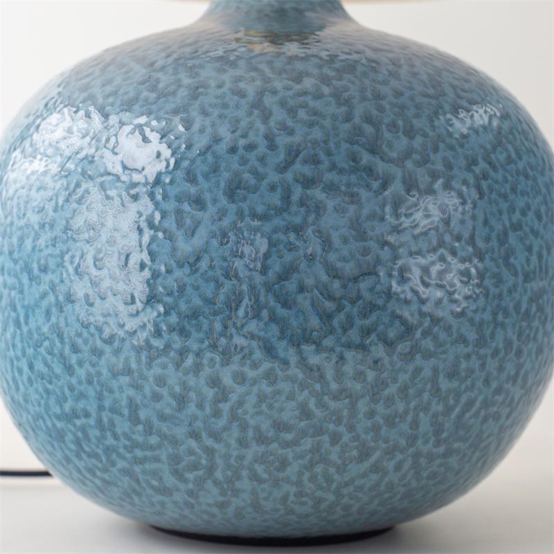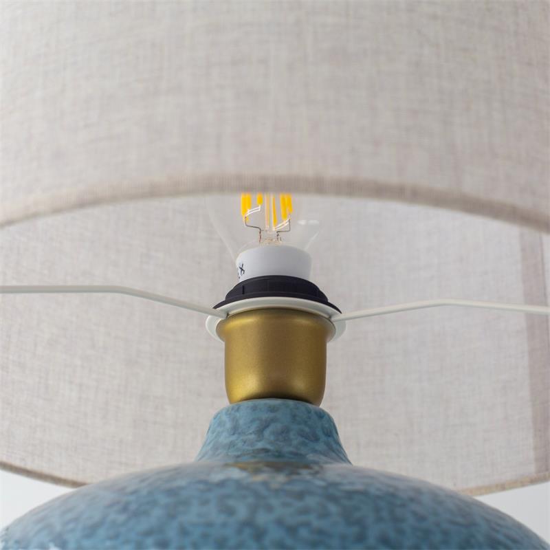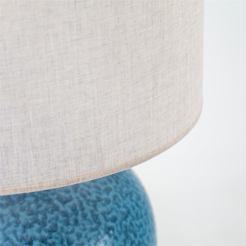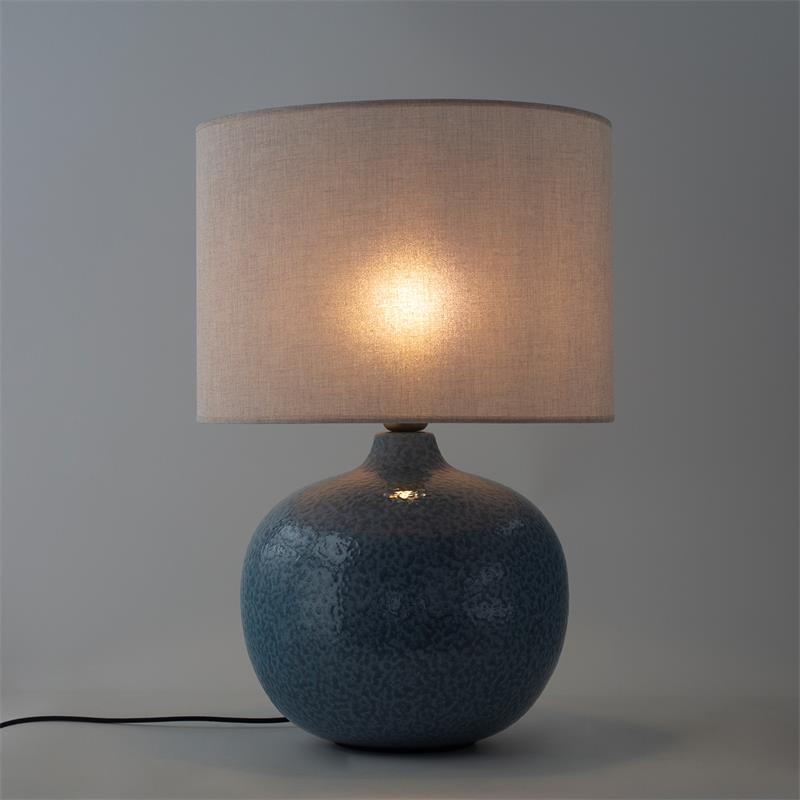 Serie GIANIRA. Fabricado en ceramica en color azul ,lino beige ,cable textil negro. Para su funcionamiento requiere 1 bombilla con casquillo E27. (bombillas no incluidas en la caja) .Apta para bombillas de tecnología Led cuya potencia máxima admitida por casquillo es de 15W. Con unas dimensiones de 32cm ancho por 32cm de profundo y 52cm de alto y un peso real aproximado de 3000 gramos.Muy fácil de limpiar con una gamuza humedecida en agua y jabón neutro, te recomendamos que evites el uso de productos químicos que puedan dañarla.