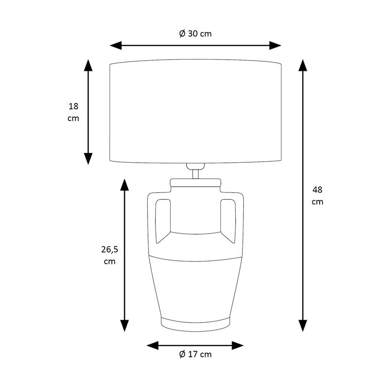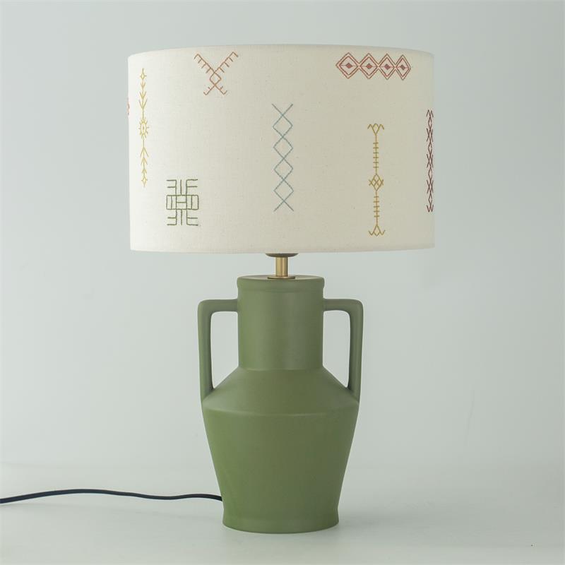 Serie JADE. Fabricado en ceramica en color verde ,textil beige ,cable textil negro. Para su funcionamiento requiere 1 bombilla con casquillo E27. (bombillas no incluidas en la caja) .Apta para bombillas de tecnología Led cuya potencia máxima admitida por casquillo es de 15W. Con unas dimensiones de 32cm ancho por 32cm de profundo y 48cm de alto y un peso real aproximado de 1480 gramos.Muy fácil de limpiar con una gamuza humedecida en agua y jabón neutro, te recomendamos que evites el uso de productos químicos que puedan dañarla.