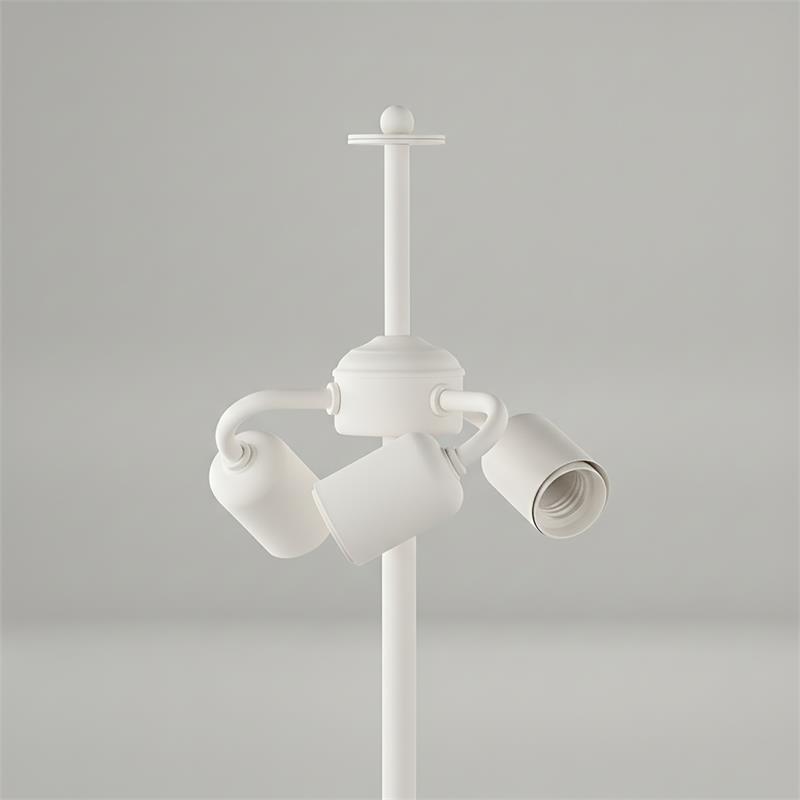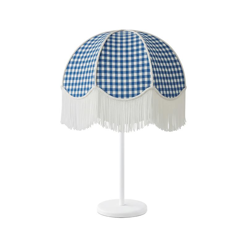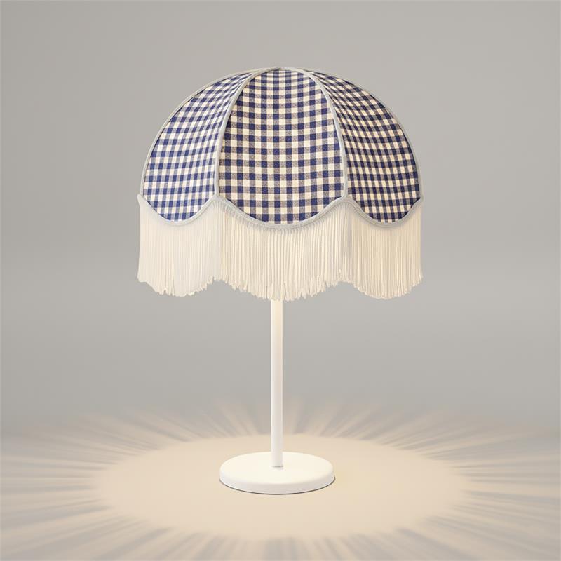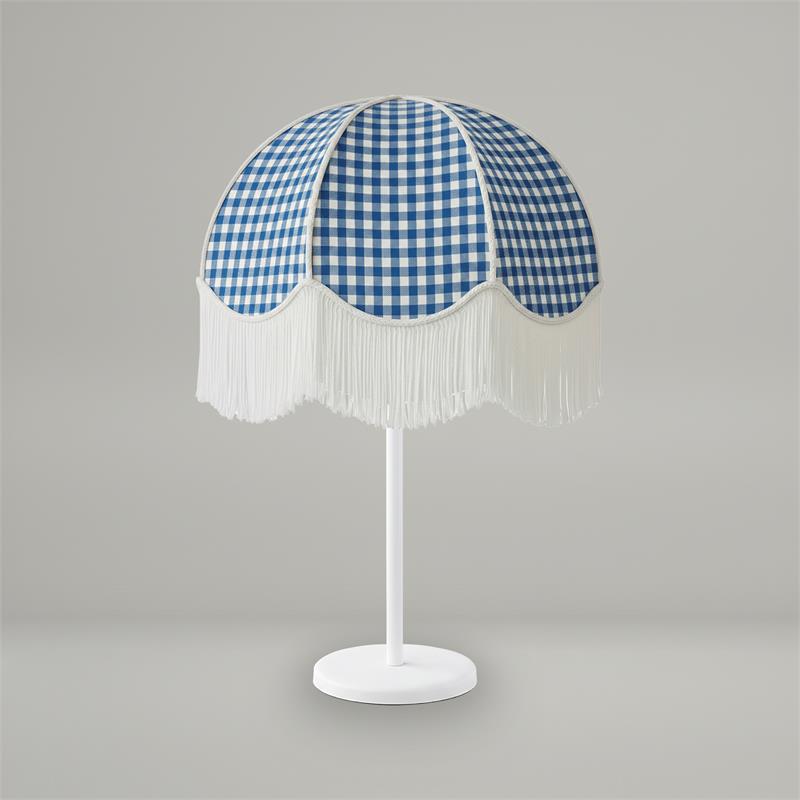 Serie NAZARIA. Fabricado en tejido en color azul ,textil blanco ,base metal blanco. Para su funcionamiento requiere 3 bombilla con casquillo E27. (bombillas no incluidas en la caja) .Apta para bombillas de tecnología Led cuya potencia máxima admitida por casquillo es de 15W. Con unas dimensiones de 40cm ancho por 40cm de profundo y 57cm de alto y un peso real aproximado de 2100 gramos.Muy fácil de limpiar con una gamuza humedecida en agua y jabón neutro, te recomendamos que evites el uso de productos químicos que puedan dañarla.