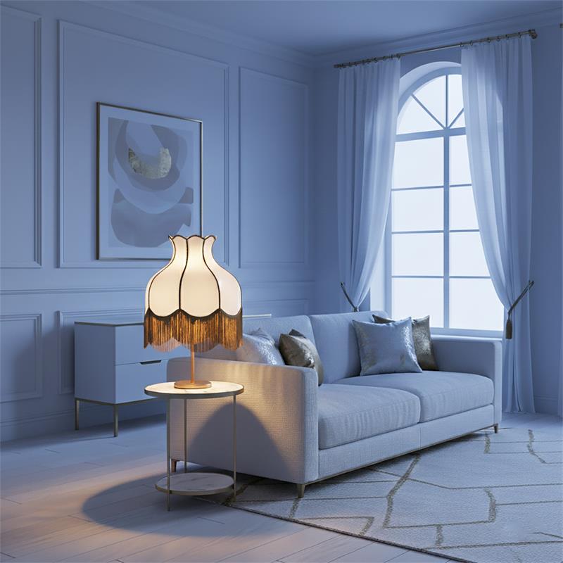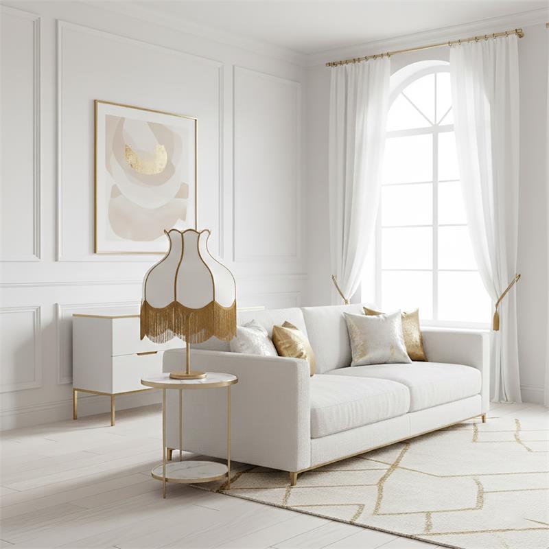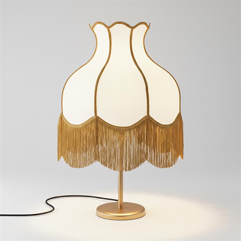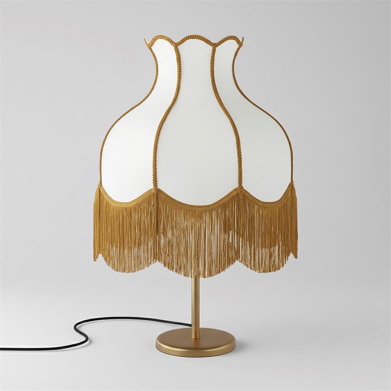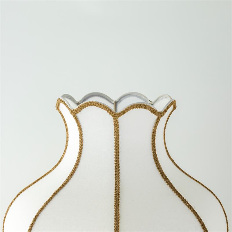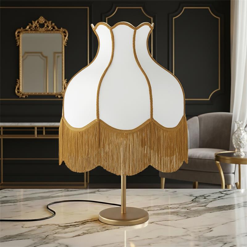 Serie SANCHICA. Fabricado en tejido en color dorado ,textil blanco ,base metal oro. Para su funcionamiento requiere 3 bombilla con casquillo E27. (bombillas no incluidas en la caja) .Apta para bombillas de tecnología Led cuya potencia máxima admitida por casquillo es de 15W. Con unas dimensiones de 40cm ancho por 40cm de profundo y 61cm de alto y un peso real aproximado de 2100 gramos.Muy fácil de limpiar con una gamuza humedecida en agua y jabón neutro, te recomendamos que evites el uso de productos químicos que puedan dañarla.