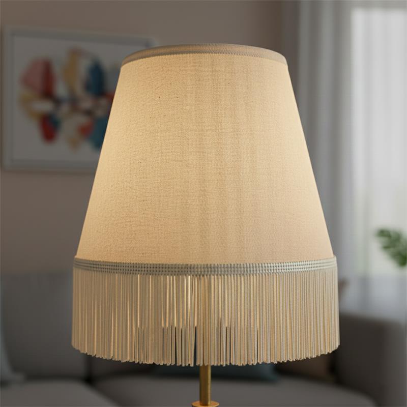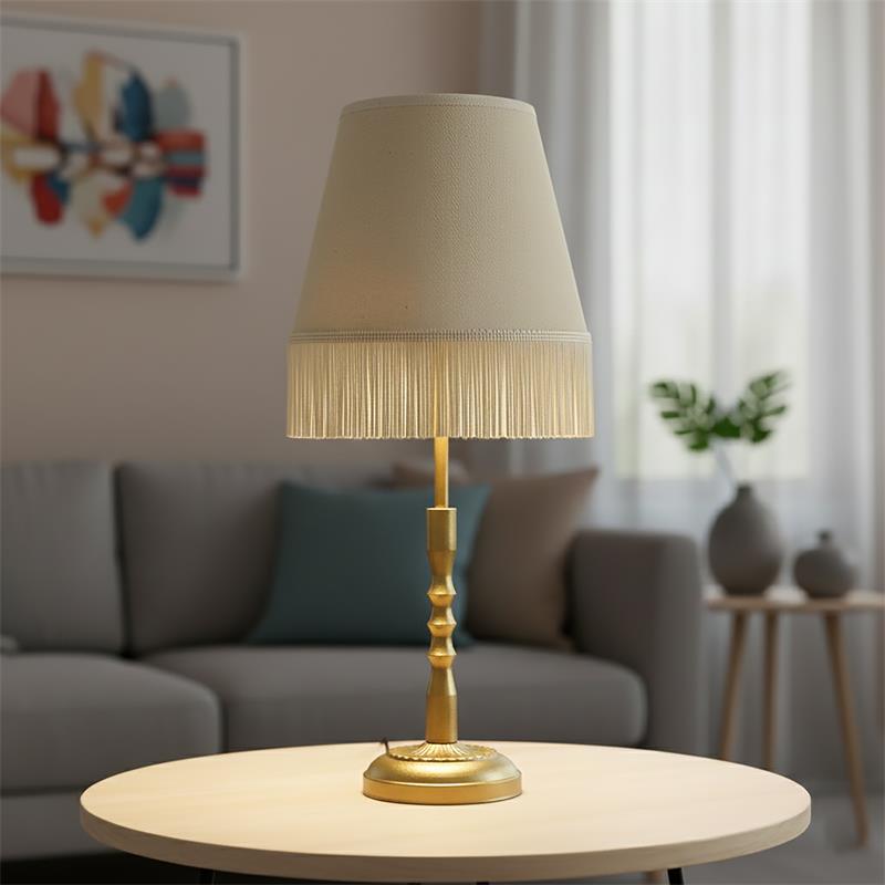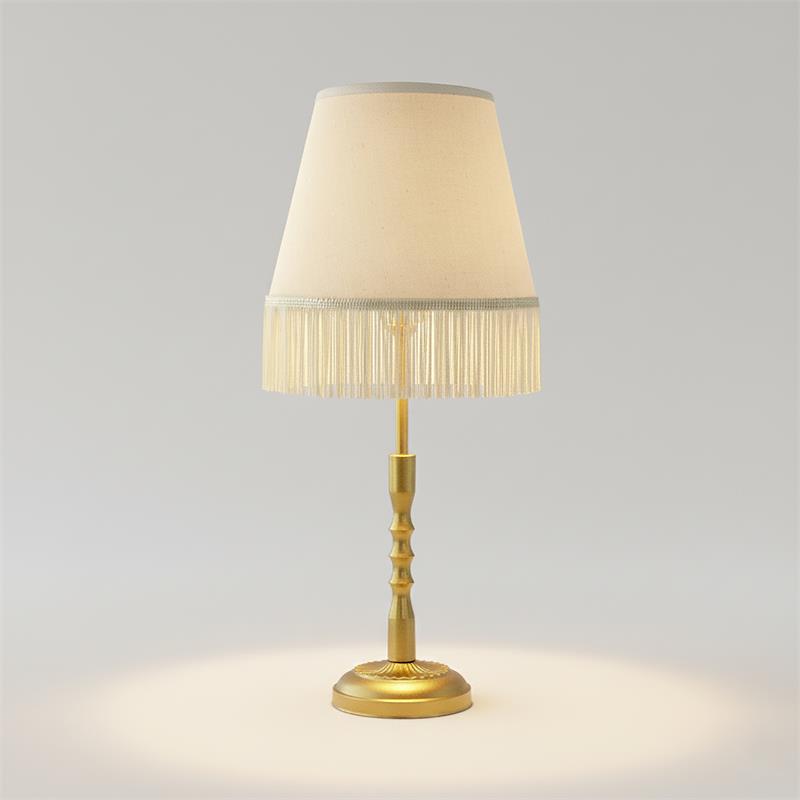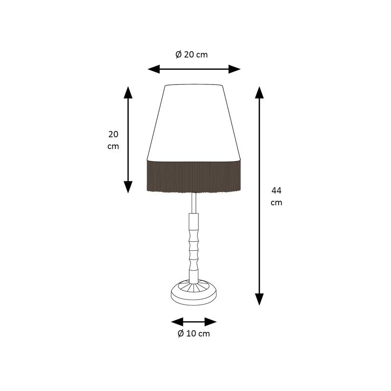 Serie SONIA. Fabricado en metal en color dorado ,textil beige ,cable pvc negro. Para su funcionamiento requiere 1 bombilla con casquillo E27. (bombillas no incluidas en la caja) .Apta para bombillas de tecnología Led cuya potencia máxima admitida por casquillo es de 15W. Con unas dimensiones de 20cm ancho por 20cm de profundo y 44cm de alto y un peso real aproximado de 600 gramos.Muy fácil de limpiar con una gamuza humedecida en agua y jabón neutro, te recomendamos que evites el uso de productos químicos que puedan dañarla.