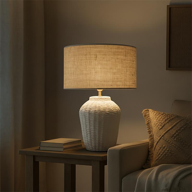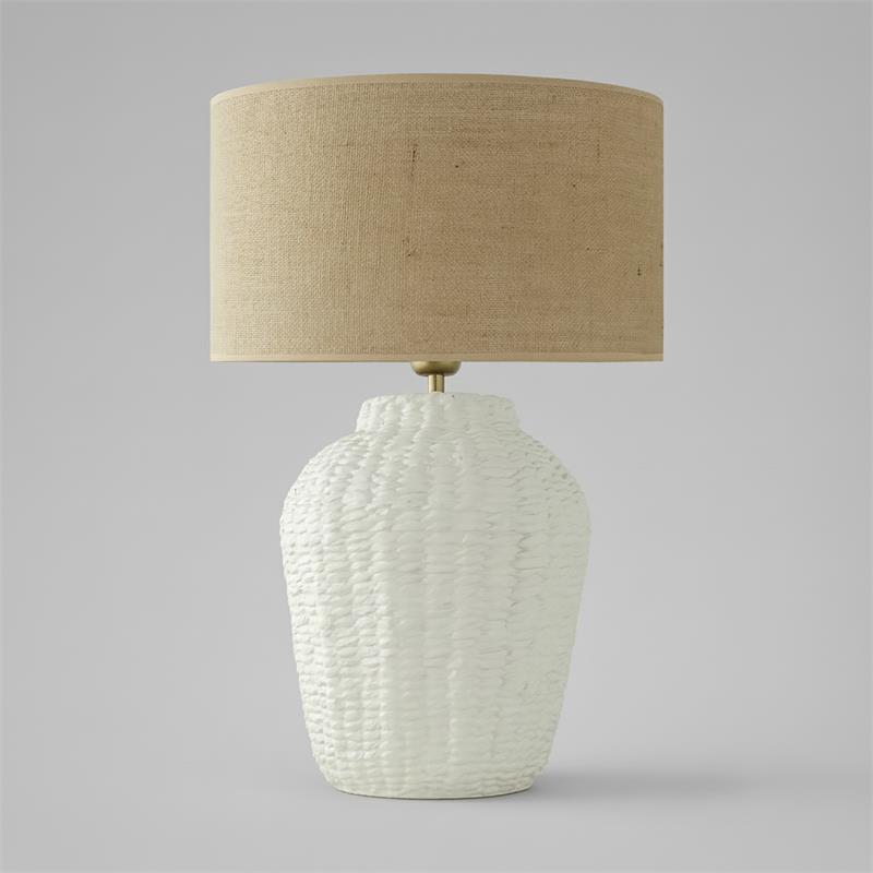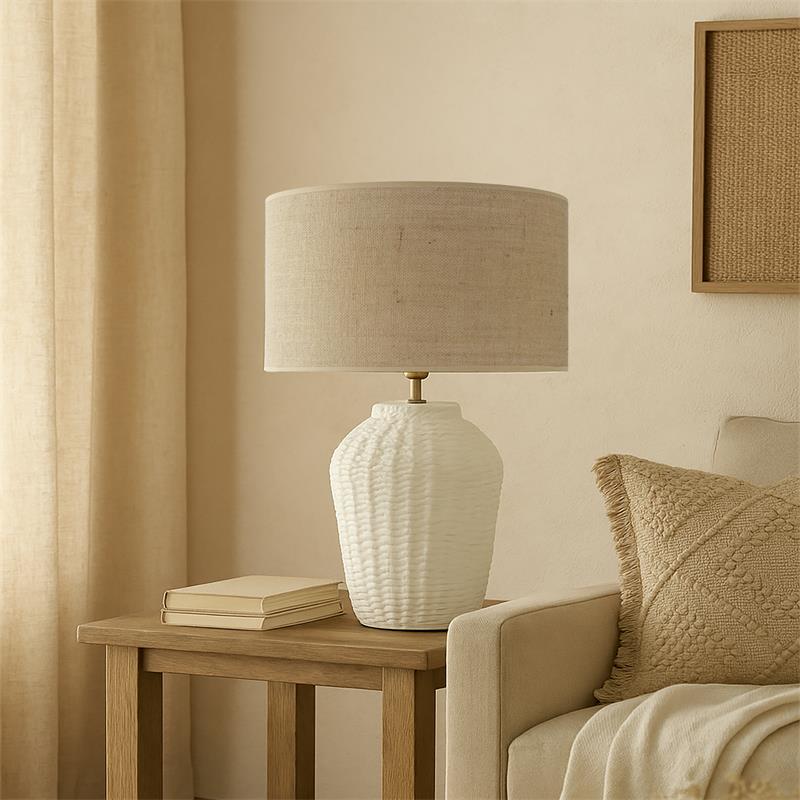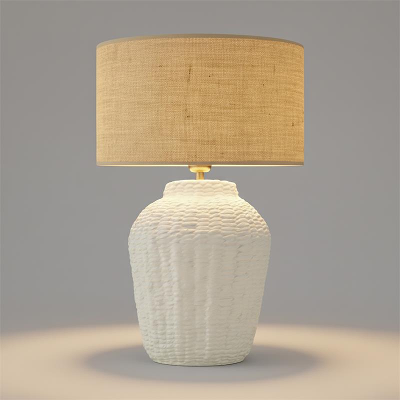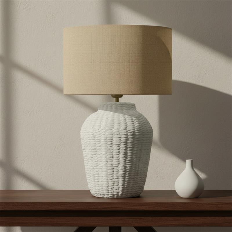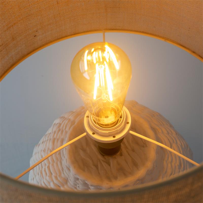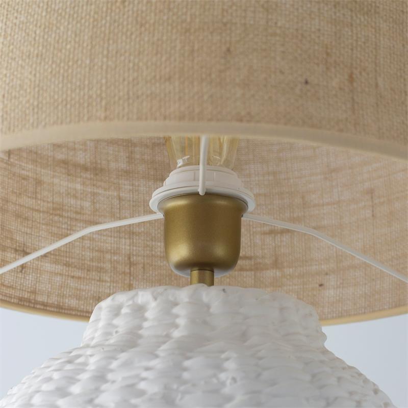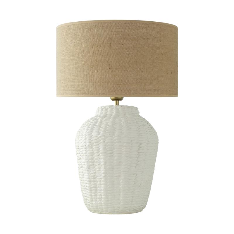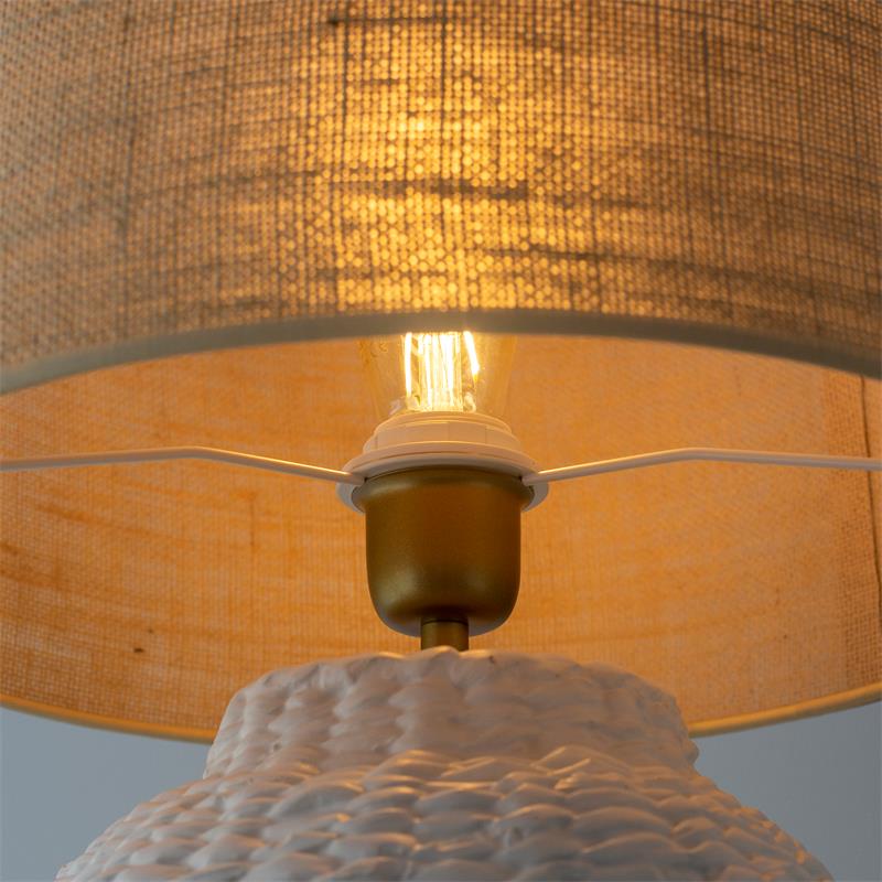 Serie ARANCHA. Fabricado en cerámica en color blanco ,yute natural ,cable pvc blanco. Para su funcionamiento requiere 1 bombilla con casquillo E27. (bombillas no incluidas en la caja) .Apta para bombillas de tecnología Led cuya potencia máxima admitida por casquillo es de 15W. Con unas dimensiones de 35cm ancho por 35cm de profundo y 54cm de alto y un peso real aproximado de 2530 gramos.Muy fácil de limpiar con una gamuza humedecida en agua y jabón neutro, te recomendamos que evites el uso de productos químicos que puedan dañarla.