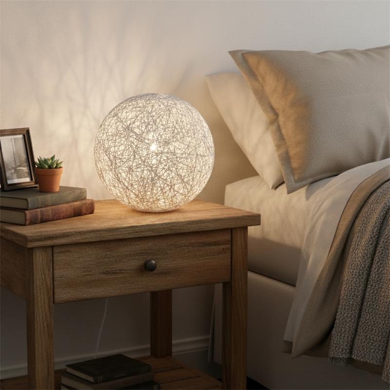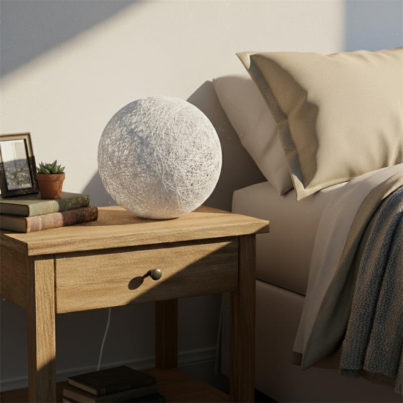 Serie MIRTO. Fabricado en rattan en color blanco , ,cable pvc blanco. Para su funcionamiento requiere 1 bombilla con casquillo E27. (bombillas no incluidas en la caja) .Apta para bombillas de tecnología Led cuya potencia máxima admitida por casquillo es de 15W. Con unas dimensiones de 18cm ancho por 18cm de profundo y 20cm de alto y un peso real aproximado de 400 gramos.Muy fácil de limpiar con una gamuza humedecida en agua y jabón neutro, te recomendamos que evites el uso de productos químicos que puedan dañarla.
