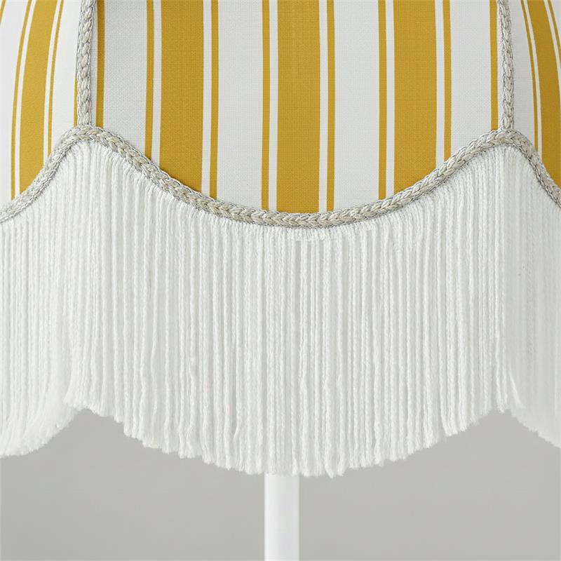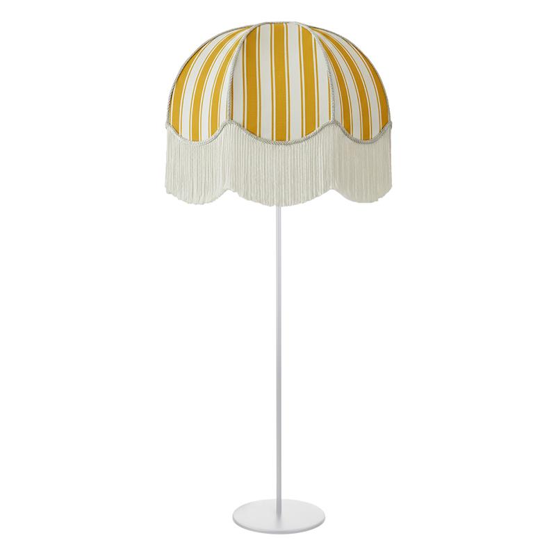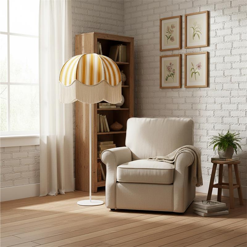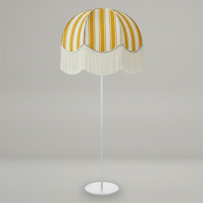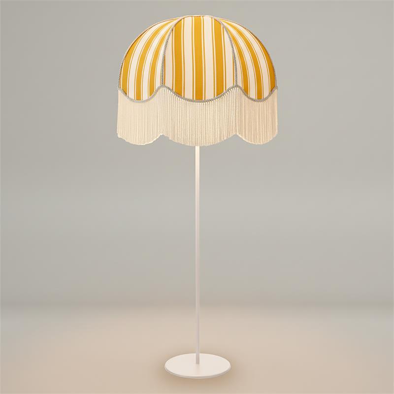 Serie LEOCADIA. Fabricado en tejido en color amarillo ,textil blanco ,base metal blanco. Para su funcionamiento requiere 3 bombilla con casquillo E27. (bombillas no incluidas en la caja) .Apta para bombillas de tecnología Led cuya potencia máxima admitida por casquillo es de 15W. Con unas dimensiones de 70cm ancho por 70cm de profundo y 165cm de alto y un peso real aproximado de 3400 gramos.Muy fácil de limpiar con una gamuza humedecida en agua y jabón neutro, te recomendamos que evites el uso de productos químicos que puedan dañarla.