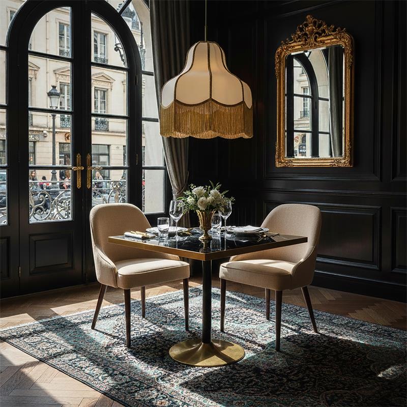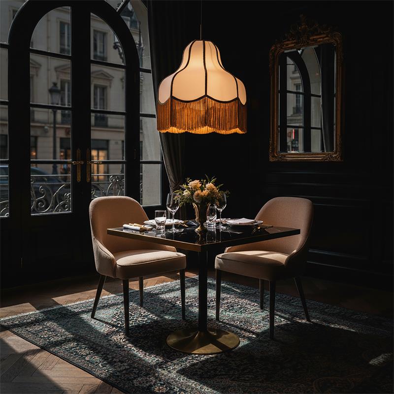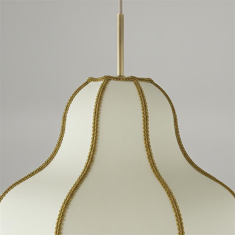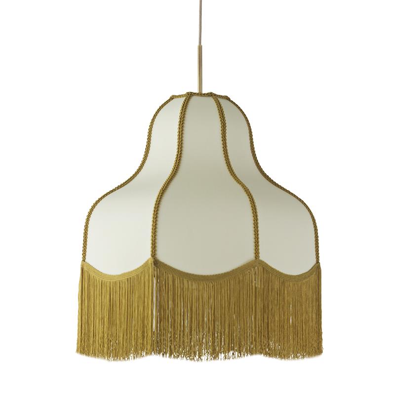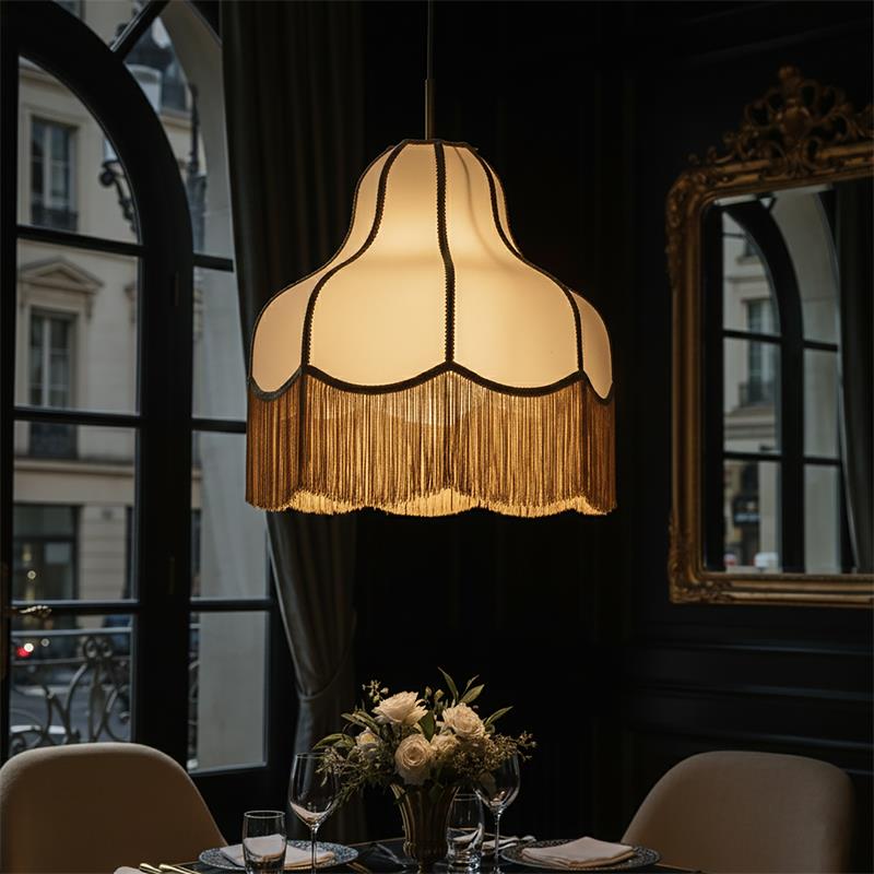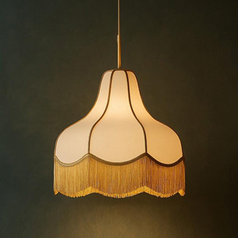 Ilumina tu espacio con elegancia con esta lámpara colgante vintage, inspirada en el diseño clásico de mediados del siglo XX. Su pantalla ondulada en tela suave, rematada con delicados flecos dorados, crea una atmósfera cálida y nostálgica ideal para salones, comedores o rincones de lectura.El diseño suspendido con acabados en dorado envejecido aporta un toque sofisticado y retro, convirtiéndola en una pieza decorativa única. Compatible con bombillas LED o incandescentes, esta lámpara es perfecta para quienes buscan un estilo retro-chic con carácter.