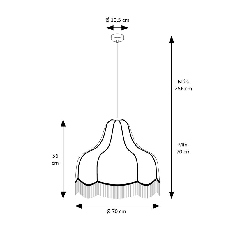 Serie LIV. Fabricado en tejido en color beige ,metal oro ,cable textil beige. Para su funcionamiento requiere 1 bombilla con casquillo E27. (bombillas no incluidas en la caja) .Apta para bombillas de tecnología Led cuya potencia máxima admitida por casquillo es de 15W. Con unas dimensiones de 70cm ancho por 70cm de profundo y 56cm de alto (regulable en altura de 70cm mínimo y 256cm máximo) y un peso real aproximado de 600 gramos.Muy fácil de limpiar con una gamuza humedecida en agua y jabón neutro, te recomendamos que evites el uso de productos químicos que puedan dañarla.