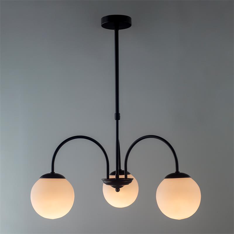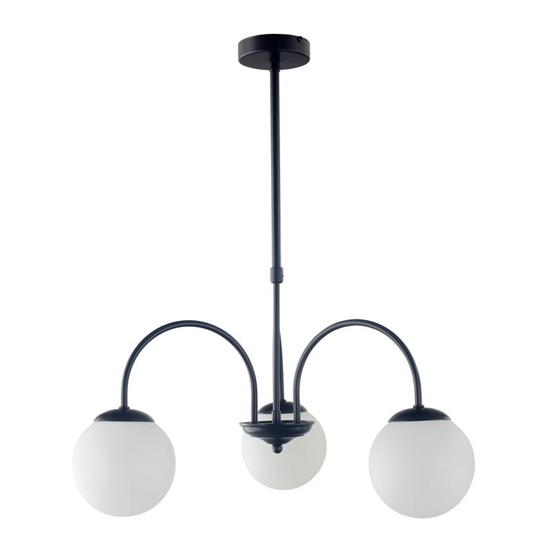 Serie ELOISE. Fabricado en metal en color negro ,vidrio blanco , . Para su funcionamiento requiere 3 bombilla con casquillo E14. (bombillas no incluidas en la caja) .Apta para bombillas de tecnología Led cuya potencia máxima admitida por casquillo es de 15W. Con unas dimensiones de 50cm ancho por 48cm de profundo y 75cm de alto (regulable en altura de 49cm mínimo y 75cm máximo) y un peso real aproximado de 1550 gramos.Muy fácil de limpiar con una gamuza humedecida en agua y jabón neutro, te recomendamos que evites el uso de productos químicos que puedan dañarla.