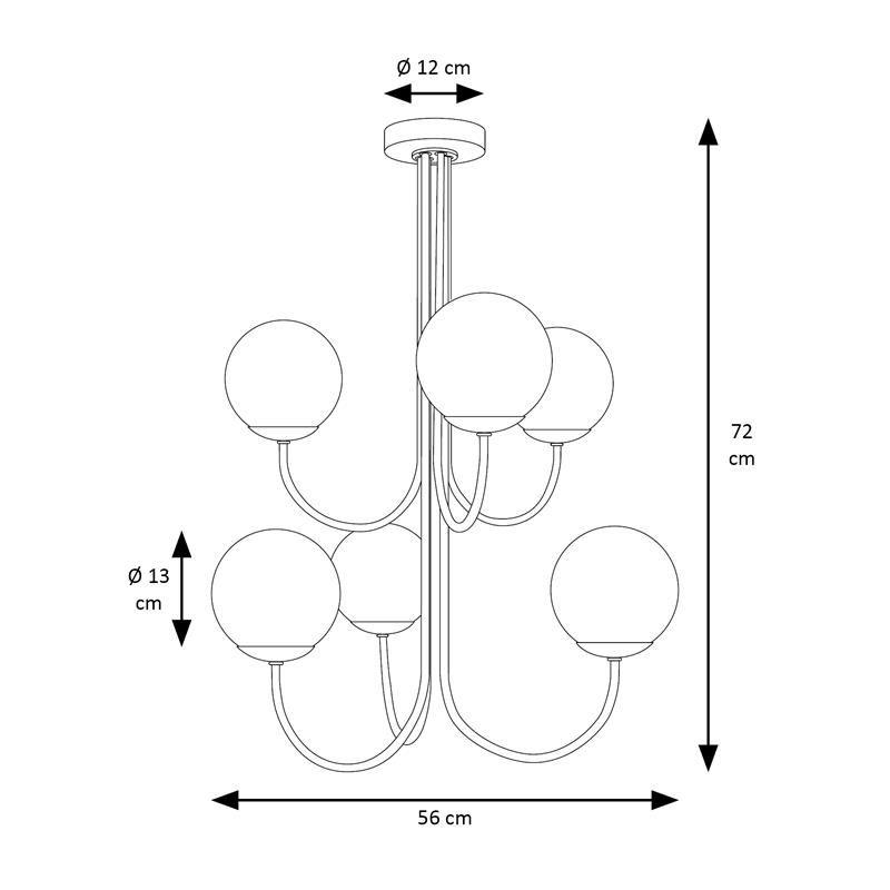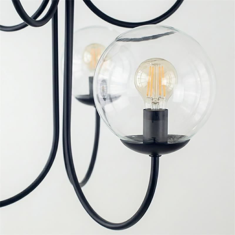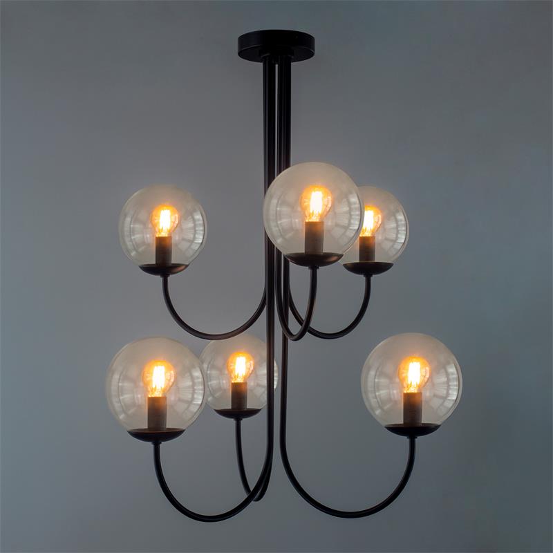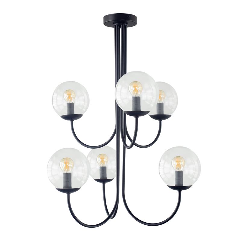 Serie CINTIA. Fabricado en metal en color negro ,vidrio transparente , . Para su funcionamiento requiere 6 bombilla con casquillo E14. (bombillas no incluidas en la caja) .Apta para bombillas de tecnología Led cuya potencia máxima admitida por casquillo es de 15W. Con unas dimensiones de 56cm ancho por 53cm de profundo y 72cm de alto y un peso real aproximado de 2950 gramos.Muy fácil de limpiar con una gamuza humedecida en agua y jabón neutro, te recomendamos que evites el uso de productos químicos que puedan dañarla.
