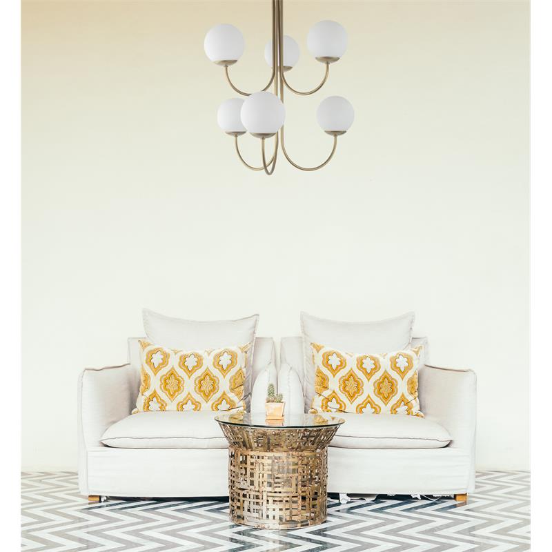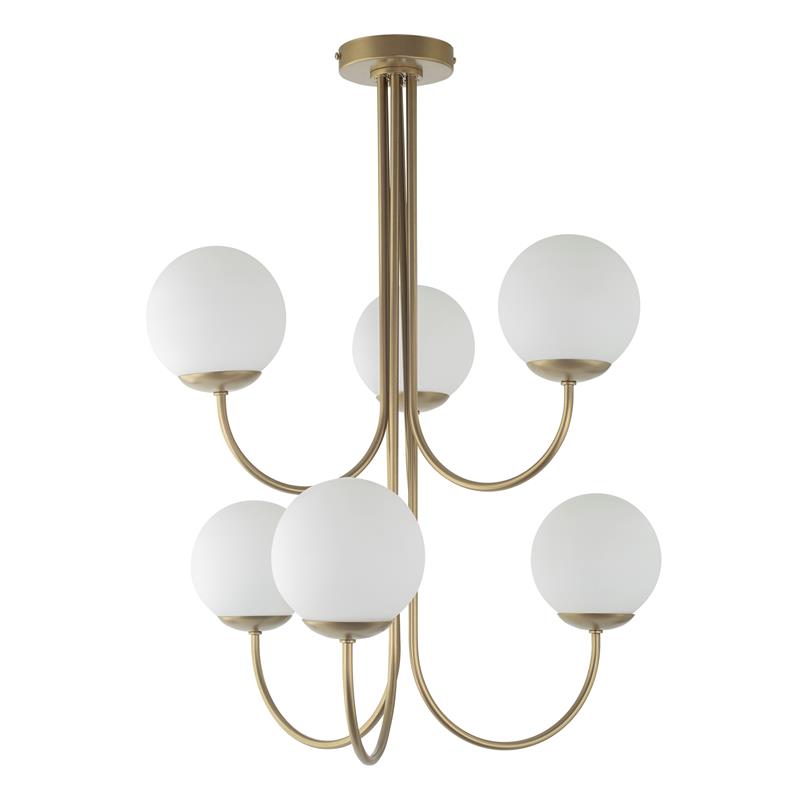 Serie CINTIA. Fabricado en metal en color dorado ,vidrio blanco , . Para su funcionamiento requiere 6 bombilla con casquillo E14. (bombillas no incluidas en la caja) .Apta para bombillas de tecnología Led cuya potencia máxima admitida por casquillo es de 15W. Con unas dimensiones de 56cm ancho por 53cm de profundo y 72cm de alto y un peso real aproximado de 2950 gramos.Muy fácil de limpiar con una gamuza humedecida en agua y jabón neutro, te recomendamos que evites el uso de productos químicos que puedan dañarla.