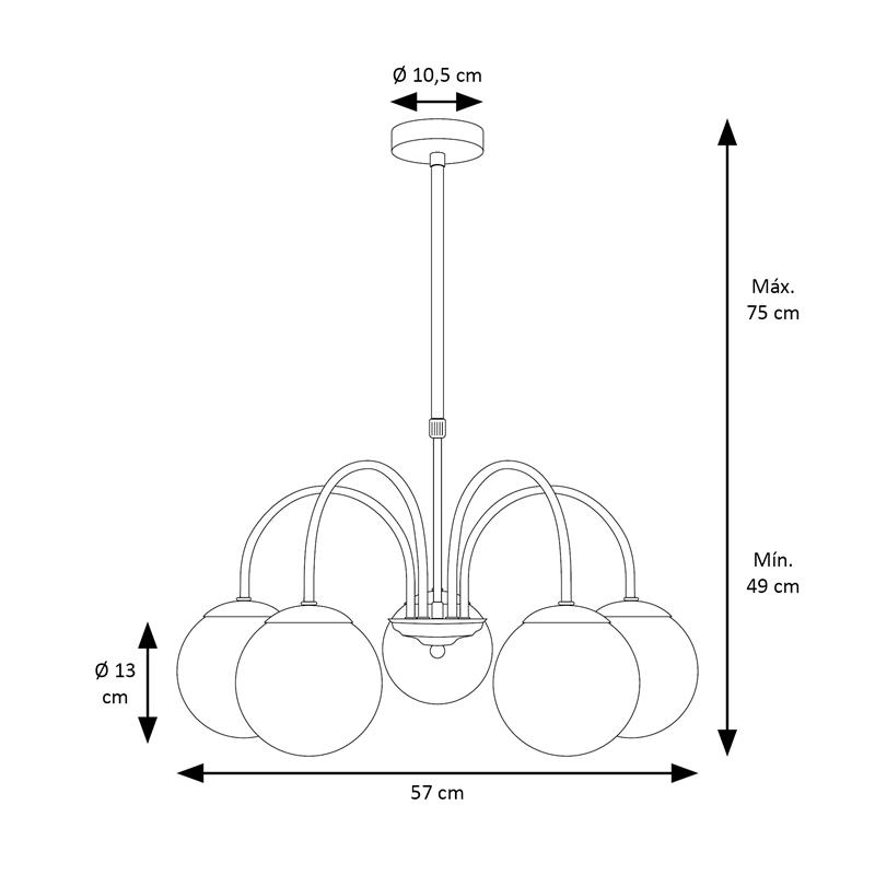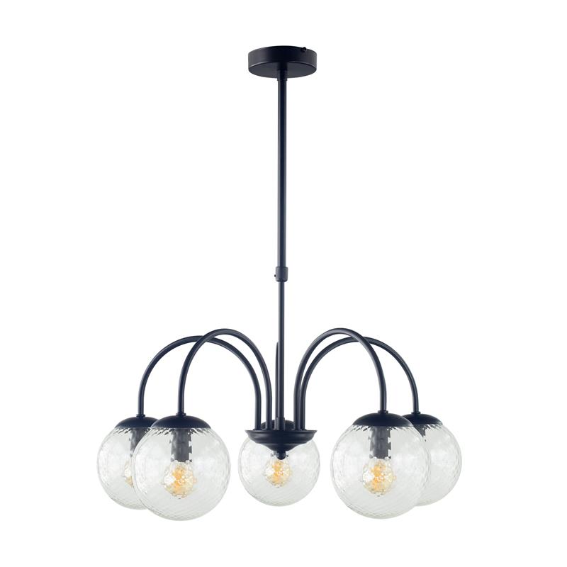 Serie ELOISE. Fabricado en metal en color negro ,vidrio transparente , . Para su funcionamiento requiere 5 bombilla con casquillo E14. (bombillas no incluidas en la caja) .Apta para bombillas de tecnología Led cuya potencia máxima admitida por casquillo es de 15W. Con unas dimensiones de 57cm ancho por 57cm de profundo y 75cm de alto (regulable en altura de 49cm mínimo y 75cm máximo) y un peso real aproximado de 2230 gramos.Muy fácil de limpiar con una gamuza humedecida en agua y jabón neutro, te recomendamos que evites el uso de productos químicos que puedan dañarla.