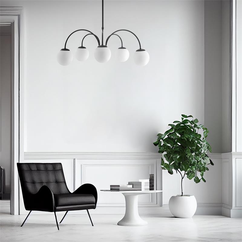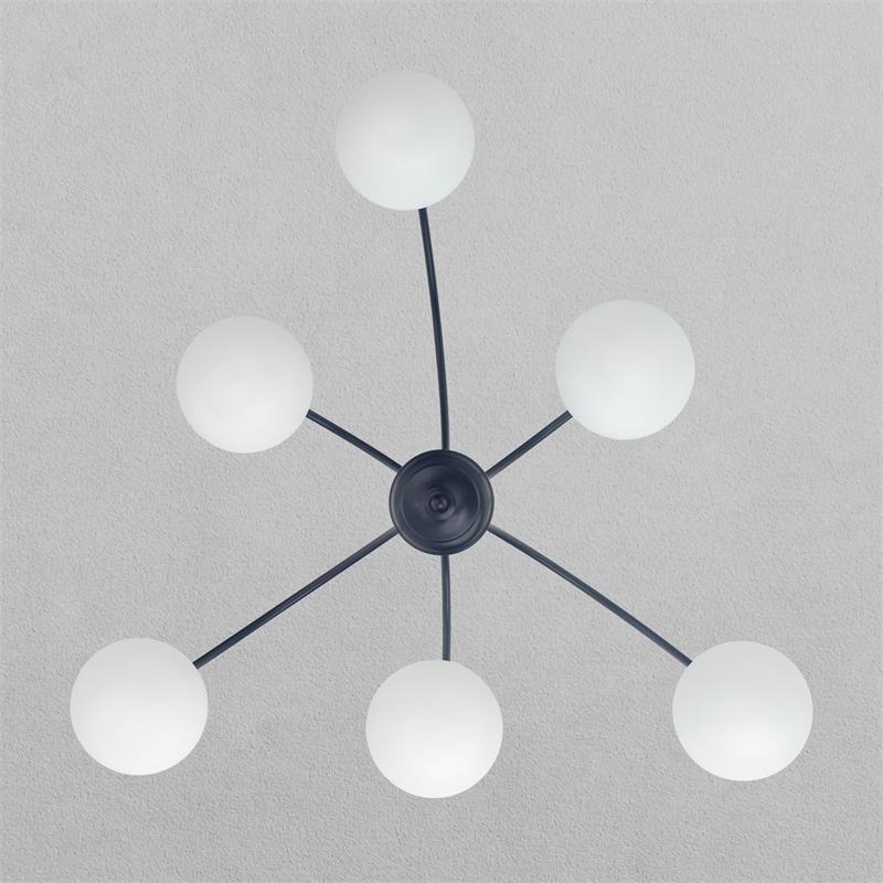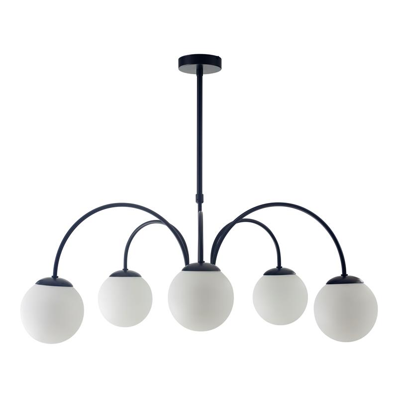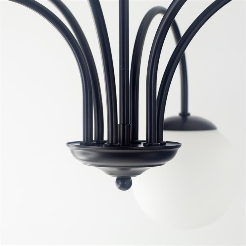 Serie ELOISE. Fabricado en metal en color negro ,vidrio blanco , . Para su funcionamiento requiere 6 bombilla con casquillo E14. (bombillas no incluidas en la caja) .Apta para bombillas de tecnología Led cuya potencia máxima admitida por casquillo es de 15W. Con unas dimensiones de 75cm ancho por 72cm de profundo y 75cm de alto (regulable en altura de 49cm mínimo y 75cm máximo) y un peso real aproximado de 2670 gramos.Muy fácil de limpiar con una gamuza humedecida en agua y jabón neutro, te recomendamos que evites el uso de productos químicos que puedan dañarla.