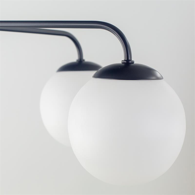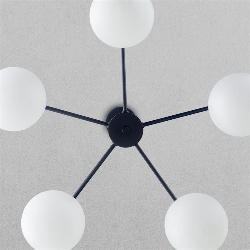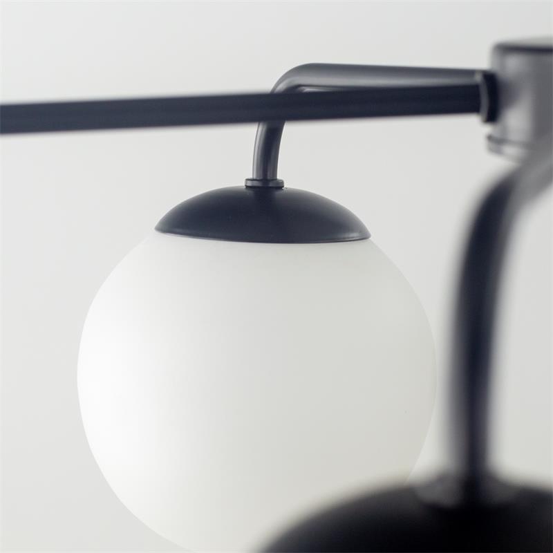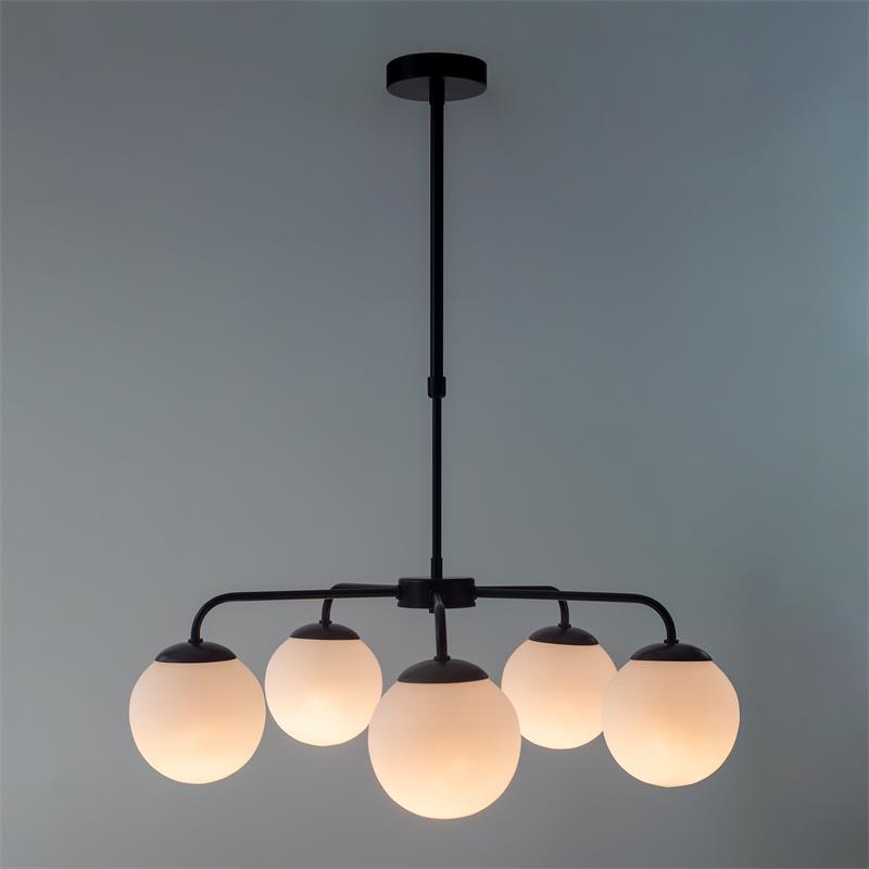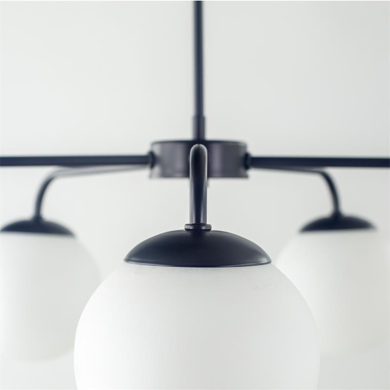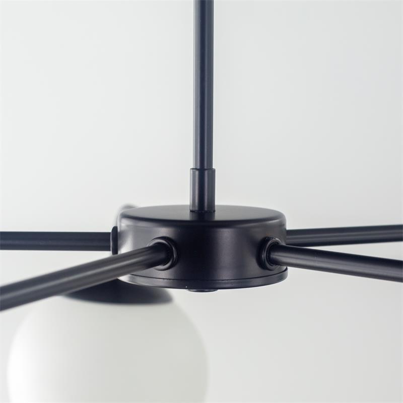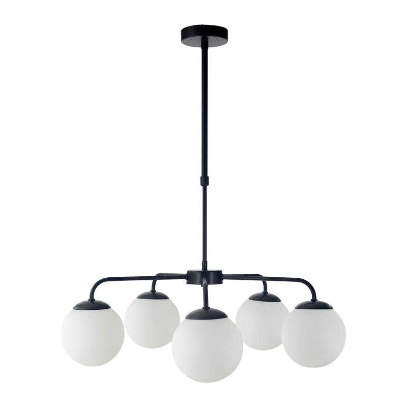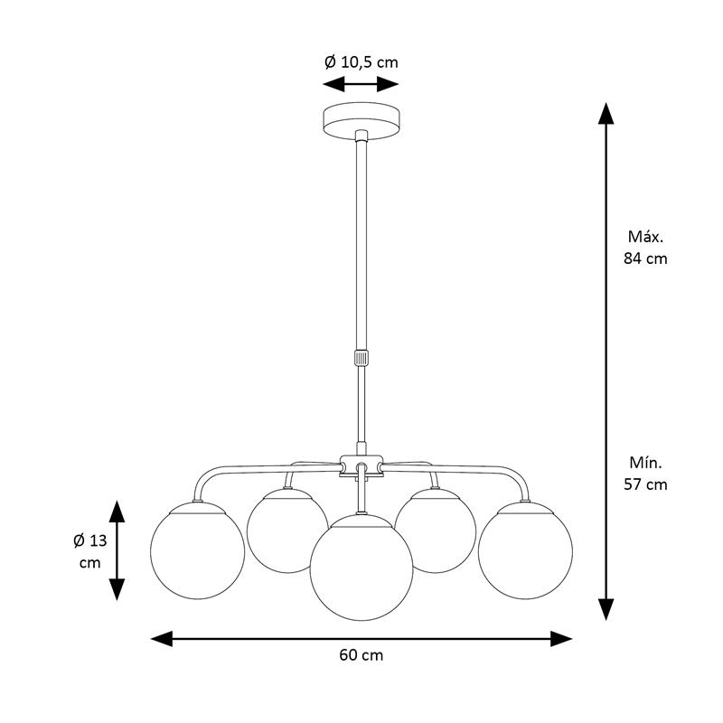 Serie PATRICIA. Fabricado en metal en color negro ,vidrio blanco , . Para su funcionamiento requiere 5 bombilla con casquillo E14. (bombillas no incluidas en la caja) .Apta para bombillas de tecnología Led cuya potencia máxima admitida por casquillo es de 15W. Con unas dimensiones de 60cm ancho por 60cm de profundo y 84cm de alto (regulable en altura de 57cm mínimo y 84cm máximo) y un peso real aproximado de 2080 gramos.Muy fácil de limpiar con una gamuza humedecida en agua y jabón neutro, te recomendamos que evites el uso de productos químicos que puedan dañarla.