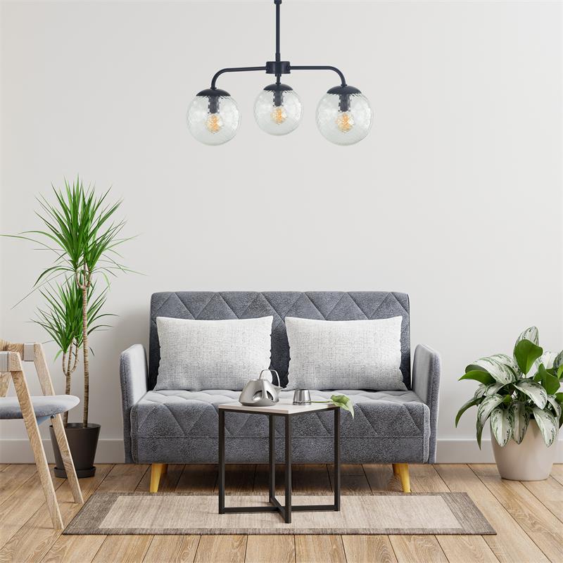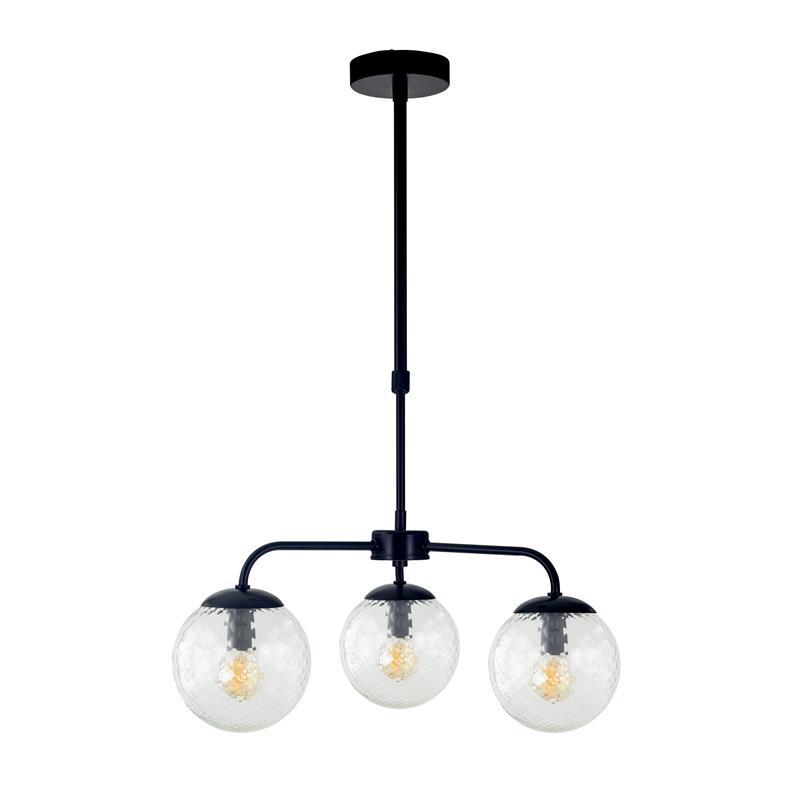 Serie PATRICIA. Fabricado en metal en color negro ,vidrio transparente , . Para su funcionamiento requiere 3 bombilla con casquillo E14. (bombillas no incluidas en la caja) .Apta para bombillas de tecnología Led cuya potencia máxima admitida por casquillo es de 15W. Con unas dimensiones de 44cm ancho por 40cm de profundo y 84cm de alto (regulable en altura de 57cm mínimo y 84cm máximo) y un peso real aproximado de 1330 gramos.Muy fácil de limpiar con una gamuza humedecida en agua y jabón neutro, te recomendamos que evites el uso de productos químicos que puedan dañarla.