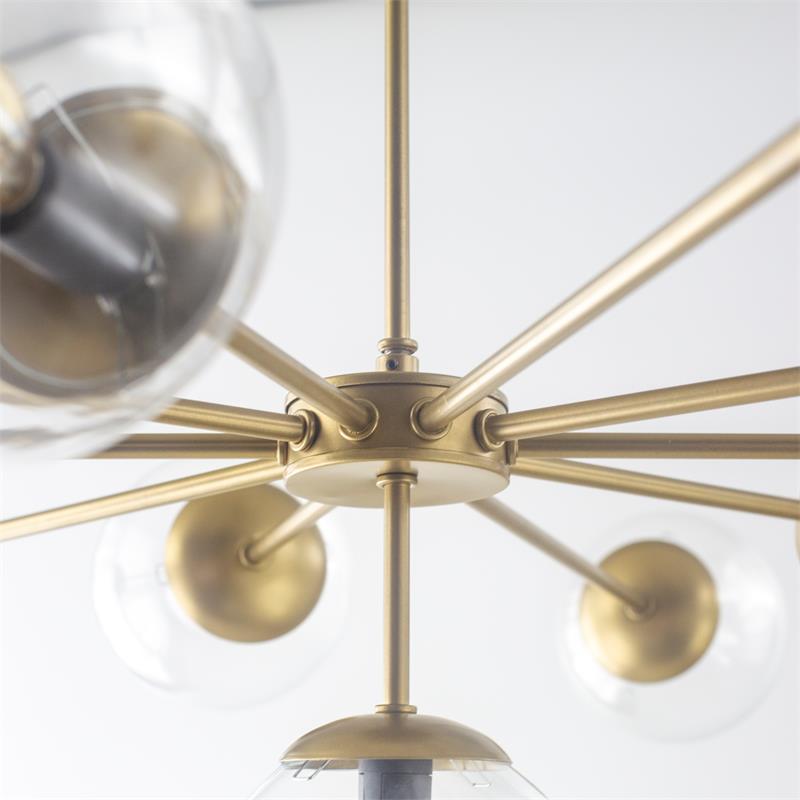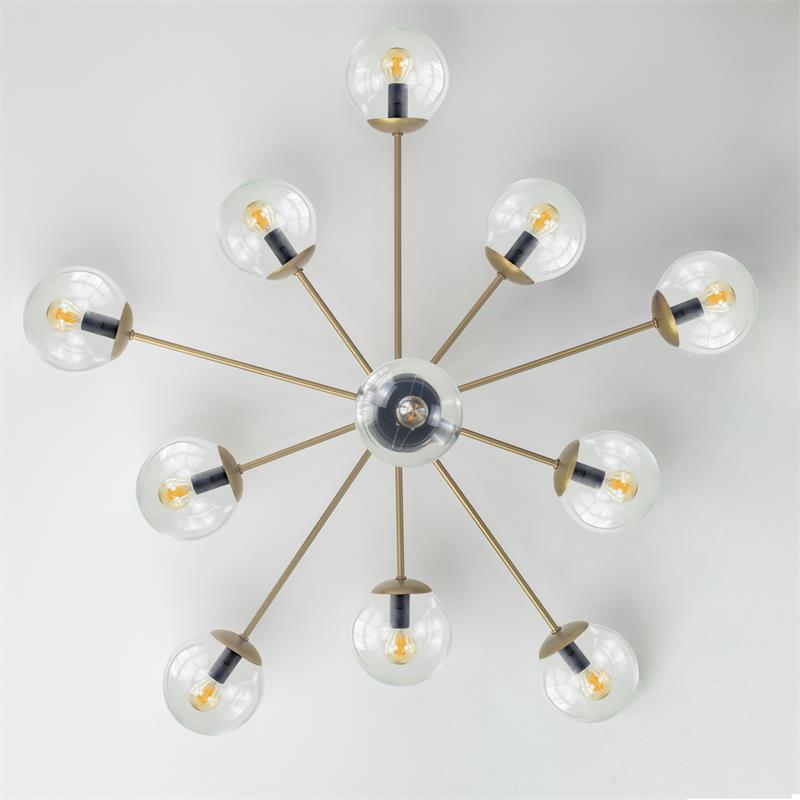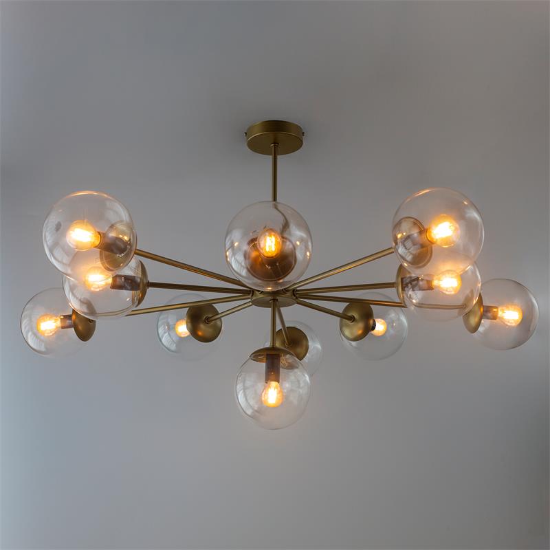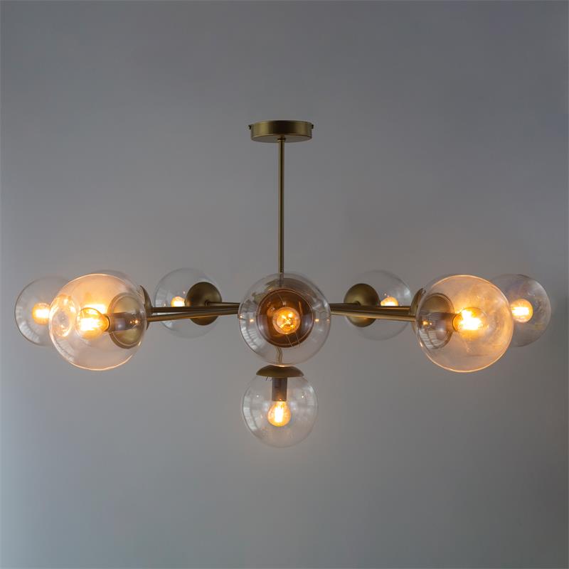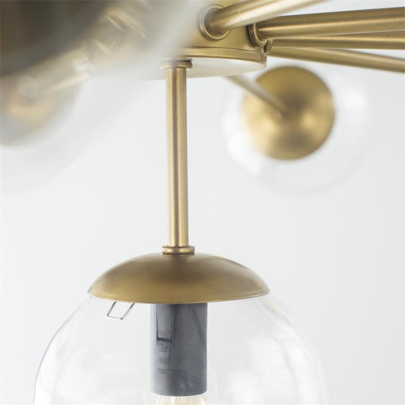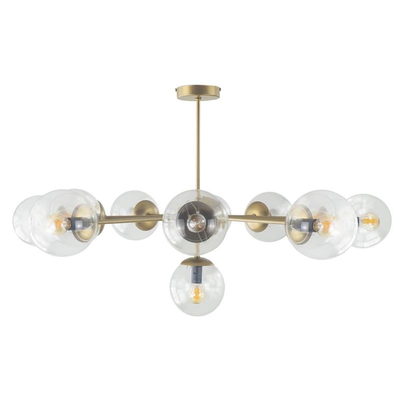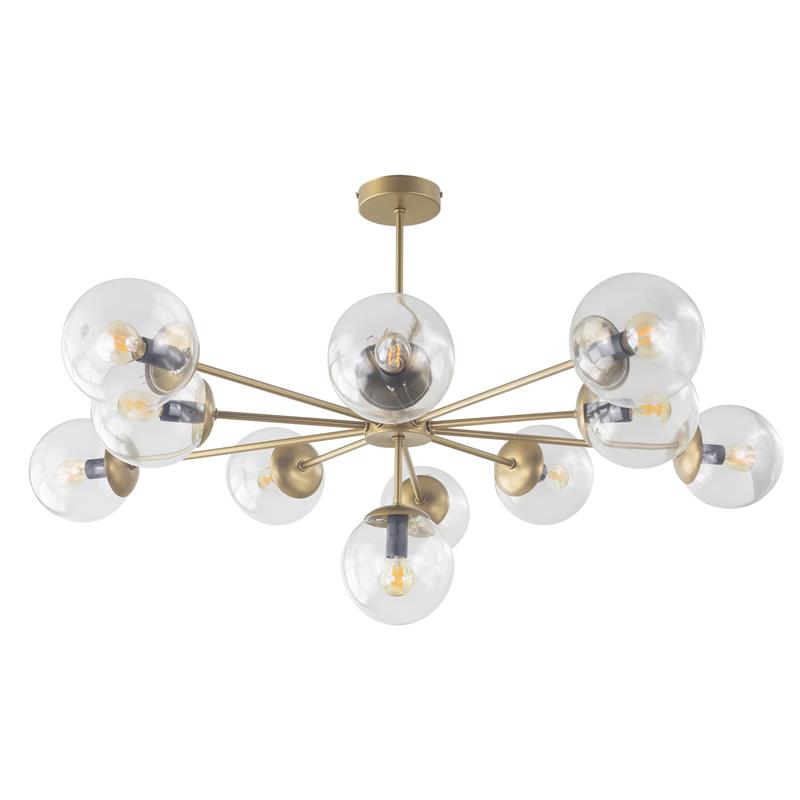 Serie PATRICIA. Fabricado en metal en color dorado ,vidrio transparente , . Para su funcionamiento requiere 11 bombilla con casquillo E14. (bombillas no incluidas en la caja) .Apta para bombillas de tecnología Led cuya potencia máxima admitida por casquillo es de 15W. Con unas dimensiones de 94cm ancho por 94cm de profundo y 55cm de alto y un peso real aproximado de 4050 gramos.Muy fácil de limpiar con una gamuza humedecida en agua y jabón neutro, te recomendamos que evites el uso de productos químicos que puedan dañarla.