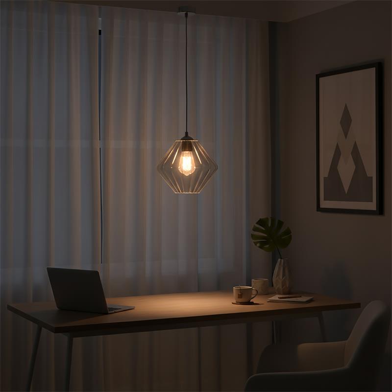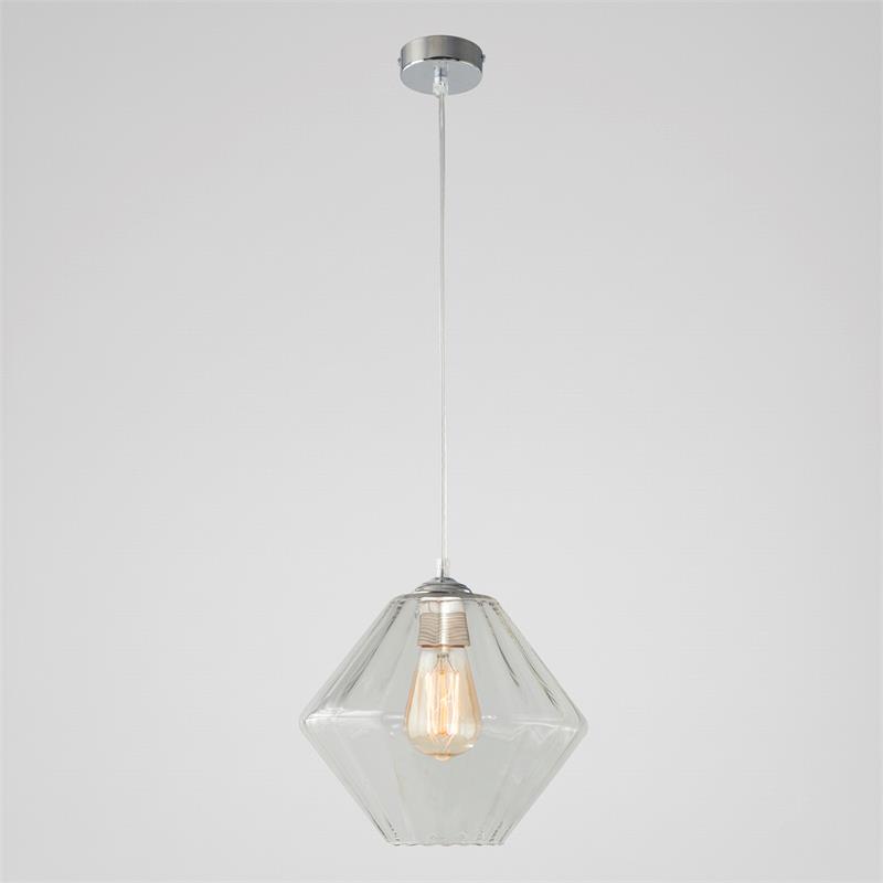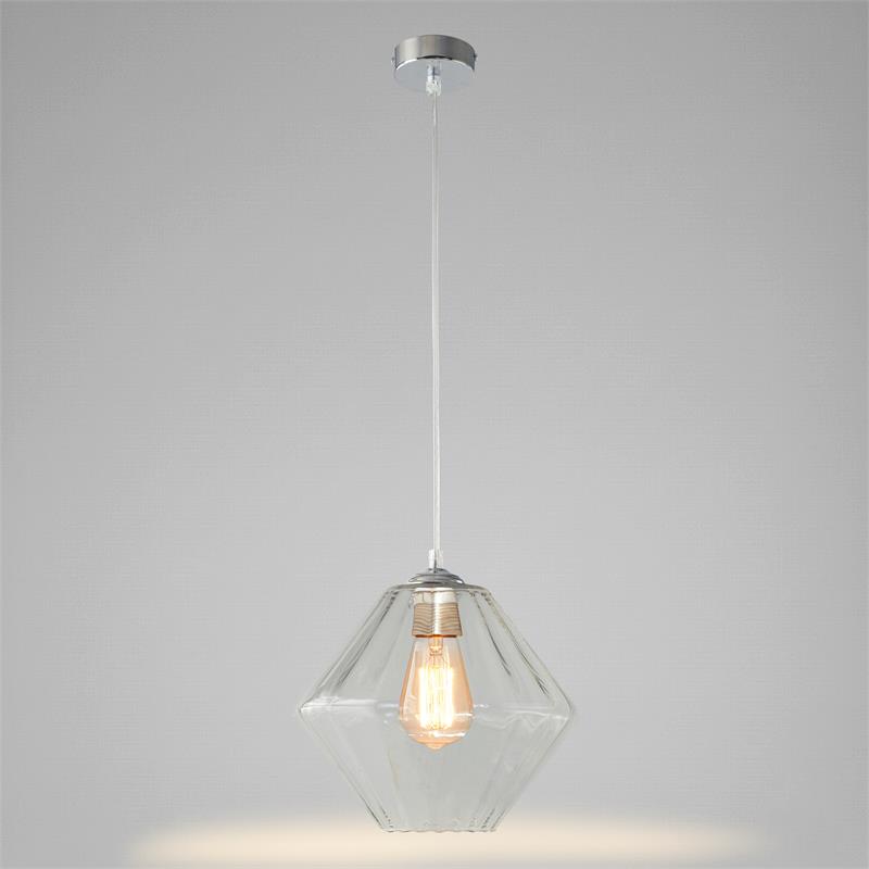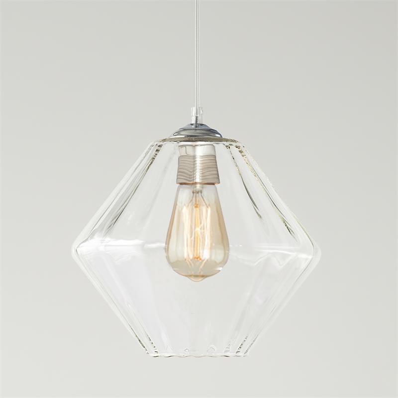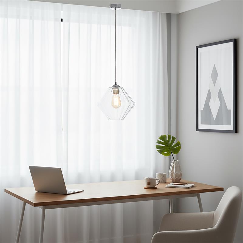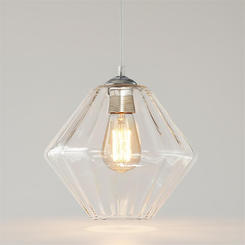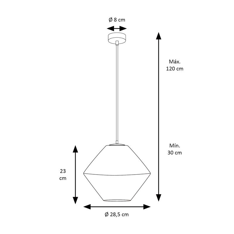 Serie BIRGITTA. Fabricado en cristal en color transparente ,metal cromo ,cable pvc transparente. Para su funcionamiento requiere 1 bombilla con casquillo E27. (bombillas no incluidas en la caja) .Apta para bombillas de tecnología Led cuya potencia máxima admitida por casquillo es de 15W. Con unas dimensiones de 28cm ancho por 28cm de profundo y 23cm de alto (regulable en altura de 30cm mínimo y 120cm máximo) y un peso real aproximado de 1180 gramos.Muy fácil de limpiar con una gamuza humedecida en agua y jabón neutro, te recomendamos que evites el uso de productos químicos que puedan dañarla.