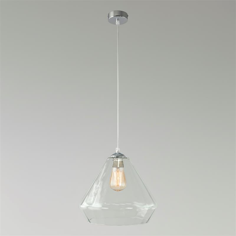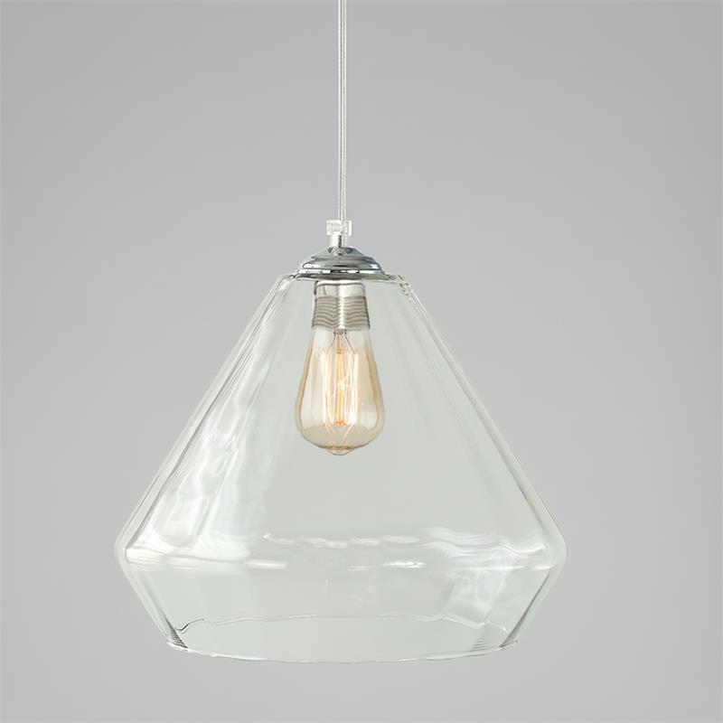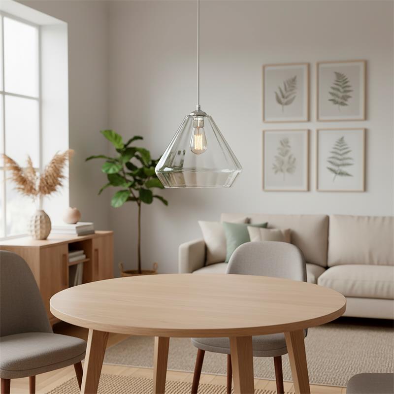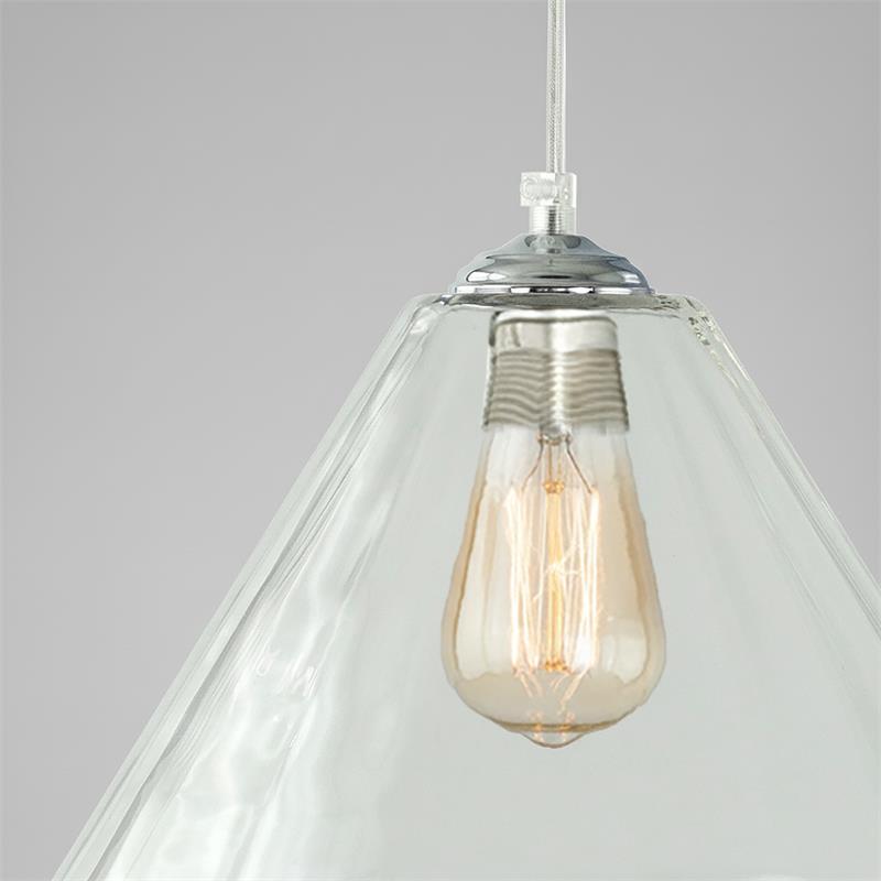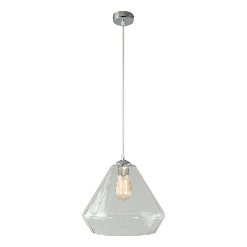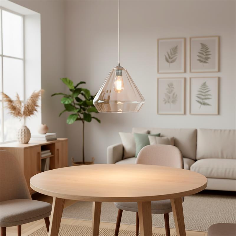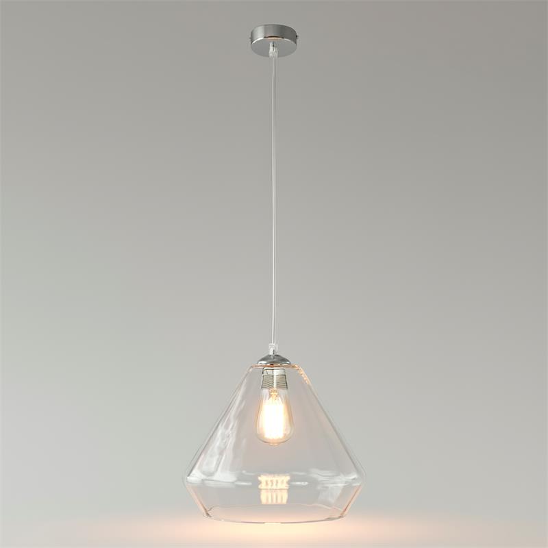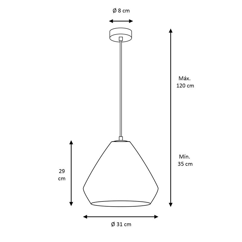 Serie BIRGITTA. Fabricado en cristal en color transparente ,metal cromo ,cable pvc transparente. Para su funcionamiento requiere 1 bombilla con casquillo E27. (bombillas no incluidas en la caja) .Apta para bombillas de tecnología Led cuya potencia máxima admitida por casquillo es de 15W. Con unas dimensiones de 31cm ancho por 31cm de profundo y 29cm de alto (regulable en altura de 40cm mínimo y 120cm máximo) y un peso real aproximado de 1850 gramos.Muy fácil de limpiar con una gamuza humedecida en agua y jabón neutro, te recomendamos que evites el uso de productos químicos que puedan dañarla.