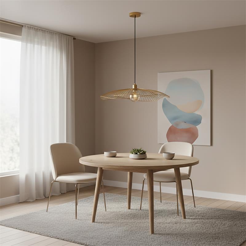 Serie CALIPSO. Fabricado en metal en color oro ,metal oro ,cable textil negro. Para su funcionamiento requiere 1 bombilla con casquillo E27. (bombillas no incluidas en la caja) .Apta para bombillas de tecnología Led cuya potencia máxima admitida por casquillo es de 15W. Con unas dimensiones de 51cm ancho por 51cm de profundo y 120cm de alto (regulable en altura de 25cm mínimo y 120cm máximo) y un peso real aproximado de 1400 gramos.Muy fácil de limpiar con una gamuza humedecida en agua y jabón neutro, te recomendamos que evites el uso de productos químicos que puedan dañarla.