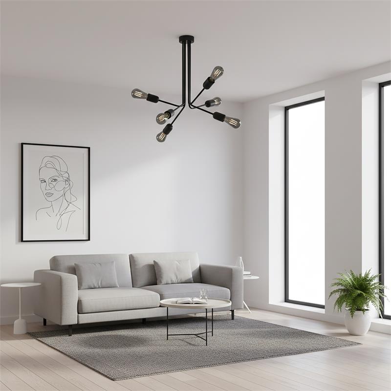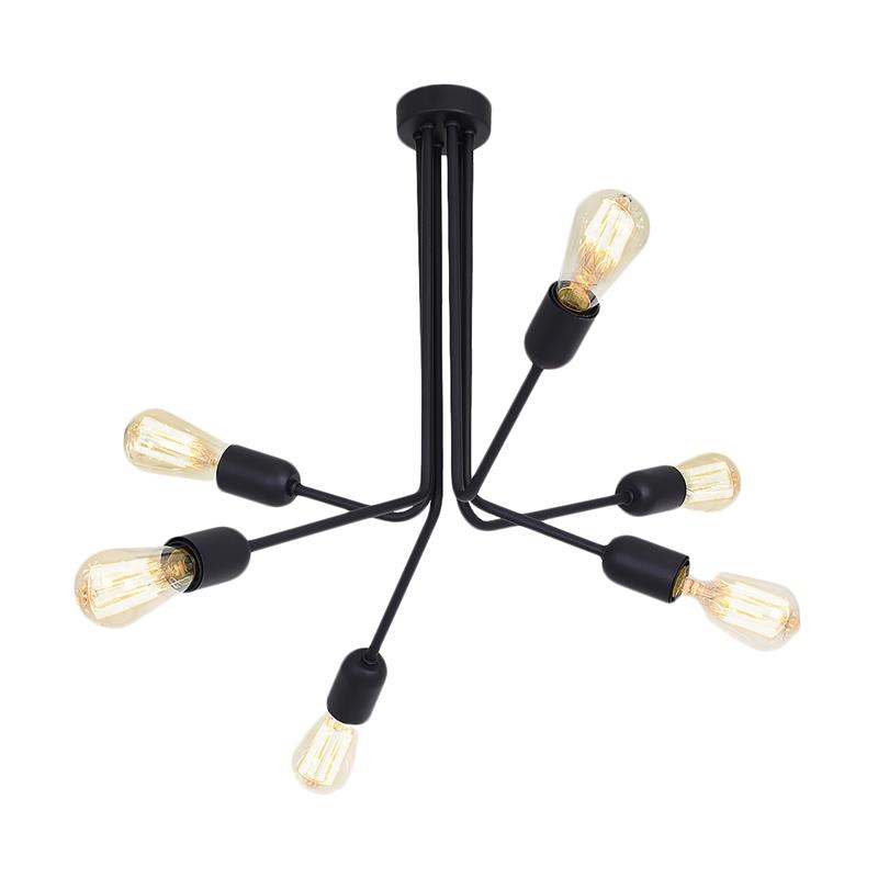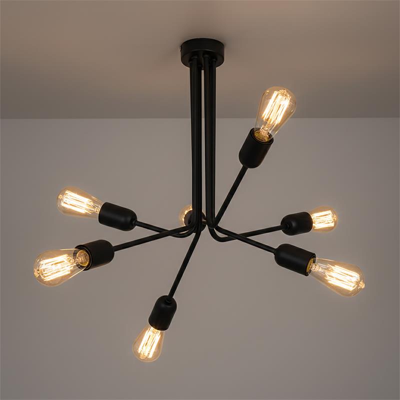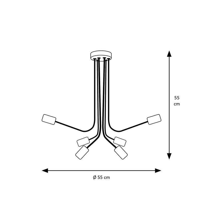 Serie LAMPARAS. Fabricado en metal en color negro , , . Para su funcionamiento requiere 6 bombilla con casquillo E27. (bombillas no incluidas en la caja) .Apta para bombillas de tecnología Led cuya potencia máxima admitida por casquillo es de 15W. Con unas dimensiones de 55cm ancho por 55cm de profundo y 55cm de alto y un peso real aproximado de 2100 gramos.Muy fácil de limpiar con una gamuza humedecida en agua y jabón neutro, te recomendamos que evites el uso de productos químicos que puedan dañarla.