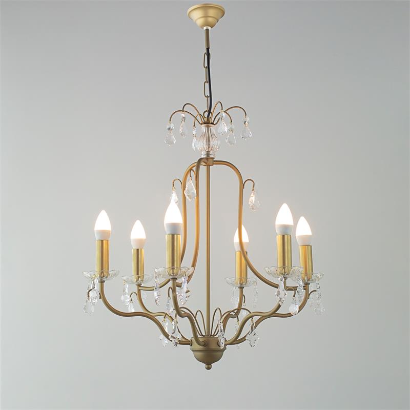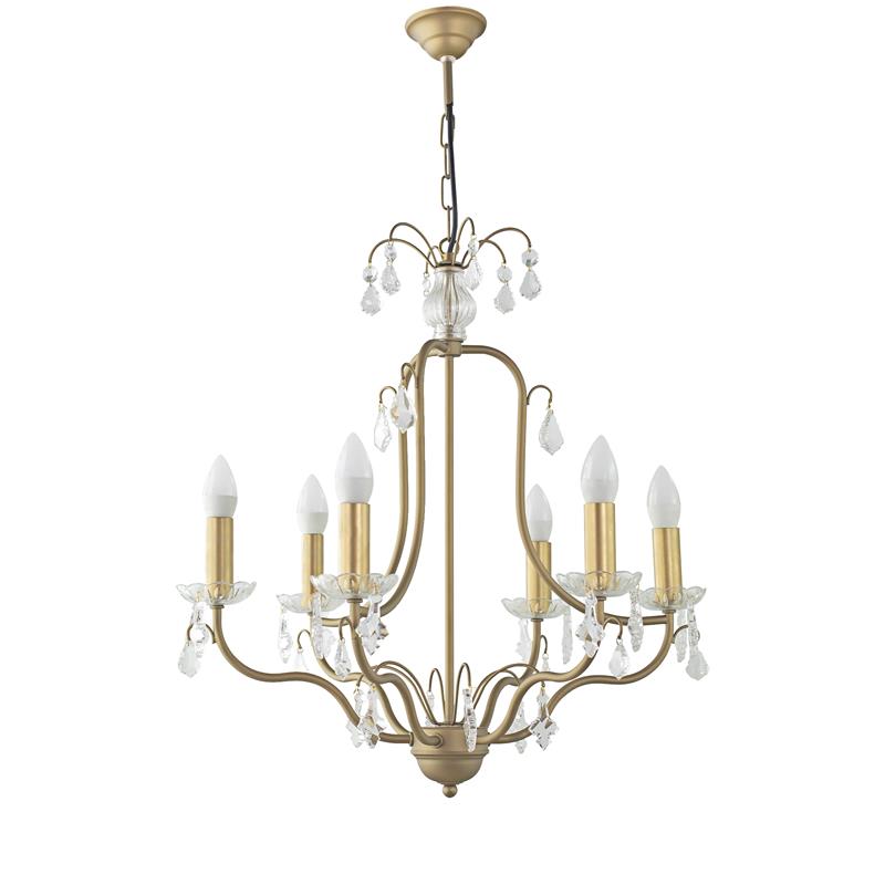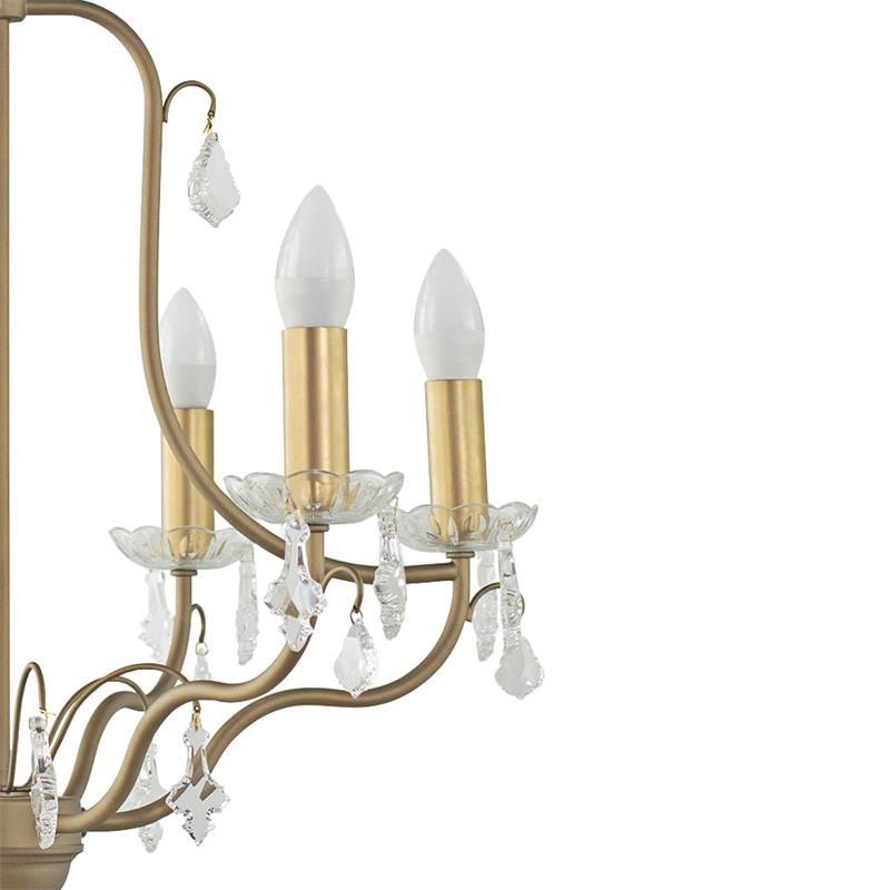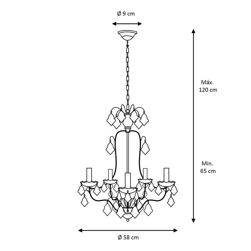 Serie CELIA. Fabricado en madera en color dorado , , . Para su funcionamiento requiere 6 bombilla con casquillo E14. (bombillas no incluidas en la caja) .Apta para bombillas de tecnología Led cuya potencia máxima admitida por casquillo es de 15W. Con unas dimensiones de 58cm ancho por 58cm de profundo y 65cm de alto y un peso real aproximado de 3000 gramos.Muy fácil de limpiar con una gamuza humedecida en agua y jabón neutro, te recomendamos que evites el uso de productos químicos que puedan dañarla.