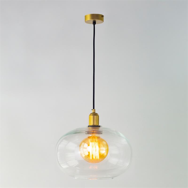 Serie ZULEMA. Fabricado en cristal en color transparente ,metal oro ,cable textil negro. Para su funcionamiento requiere 1 bombilla con casquillo E27. (bombillas no incluidas en la caja) .Apta para bombillas de tecnología Led cuya potencia máxima admitida por casquillo es de 15W. Con unas dimensiones de 30cm ancho por 30cm de profundo y 120cm de alto (regulable en altura de 40cm mínimo y 120cm máximo) y un peso real aproximado de 460 gramos.Muy fácil de limpiar con una gamuza humedecida en agua y jabón neutro, te recomendamos que evites el uso de productos químicos que puedan dañarla.