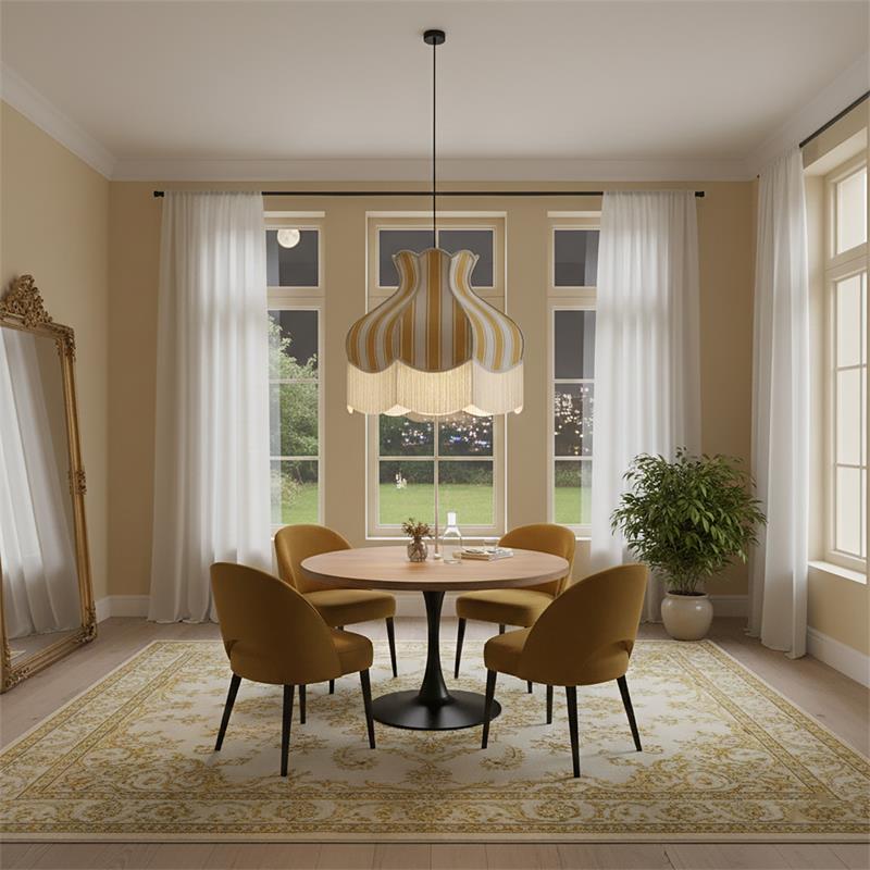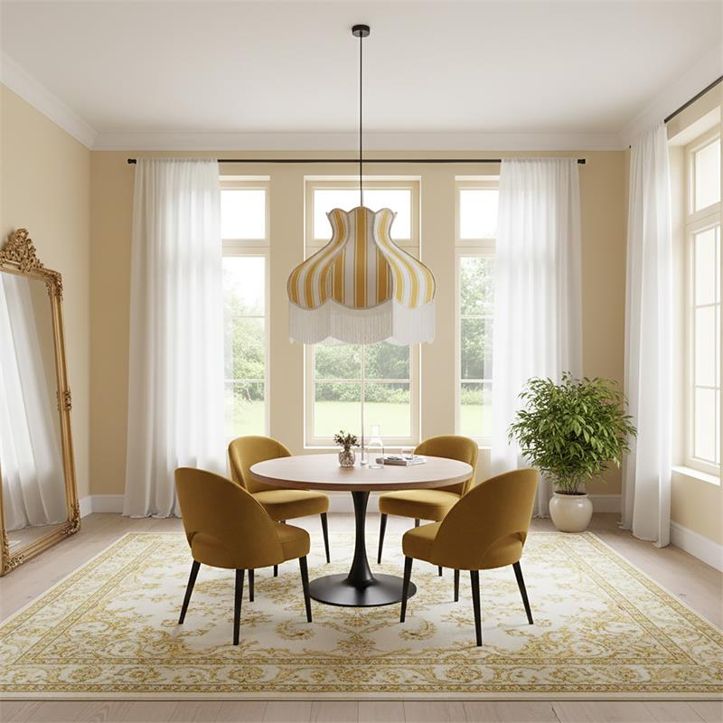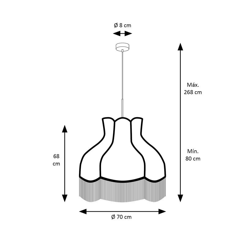 Serie EPIFANIA. Fabricado en tejido en color amarillo ,textil blanco ,cable textil negro. Para su funcionamiento requiere 1 bombilla con casquillo E27. (bombillas no incluidas en la caja) .Apta para bombillas de tecnología Led cuya potencia máxima admitida por casquillo es de 15W. Con unas dimensiones de 70cm ancho por 70cm de profundo y 268cm de alto (regulable en altura de 80cm mínimo y 268cm máximo) y un peso real aproximado de 2000 gramos.Muy fácil de limpiar con una gamuza humedecida en agua y jabón neutro, te recomendamos que evites el uso de productos químicos que puedan dañarla.