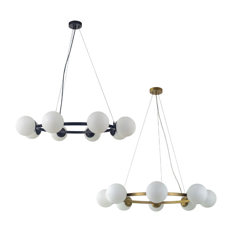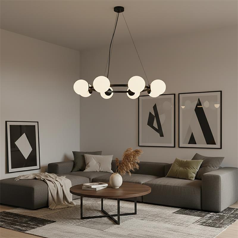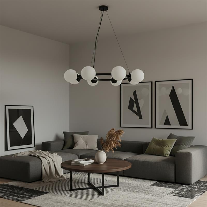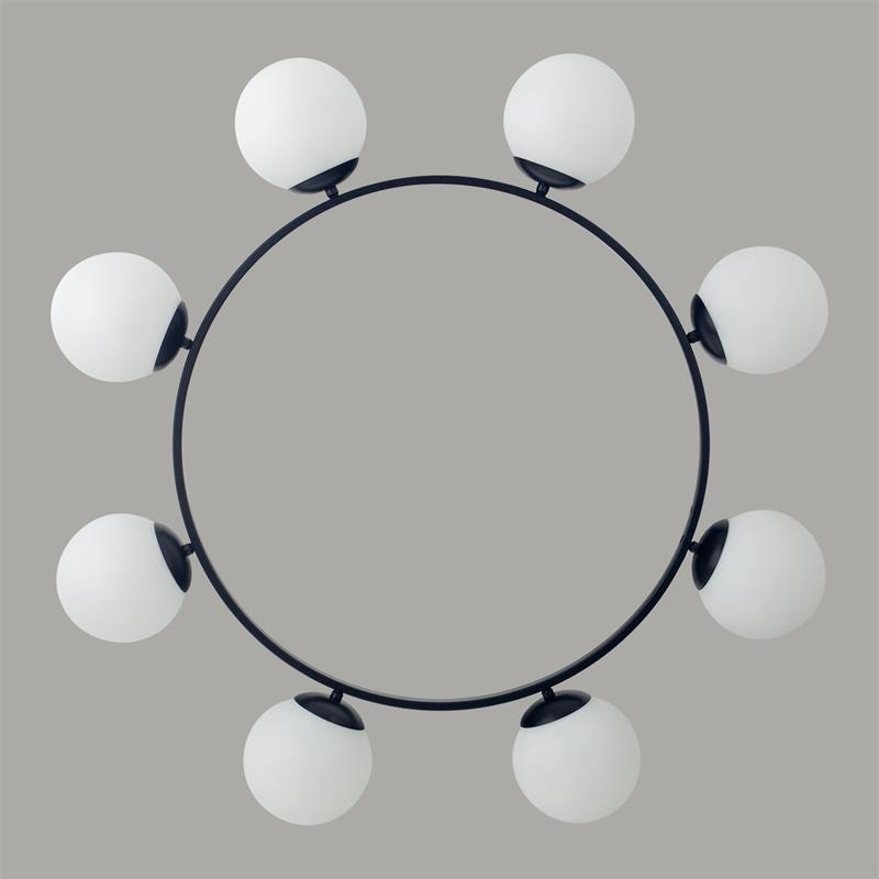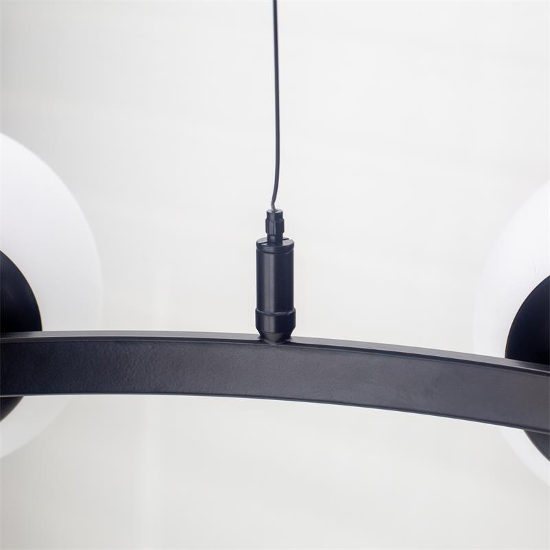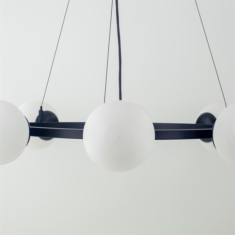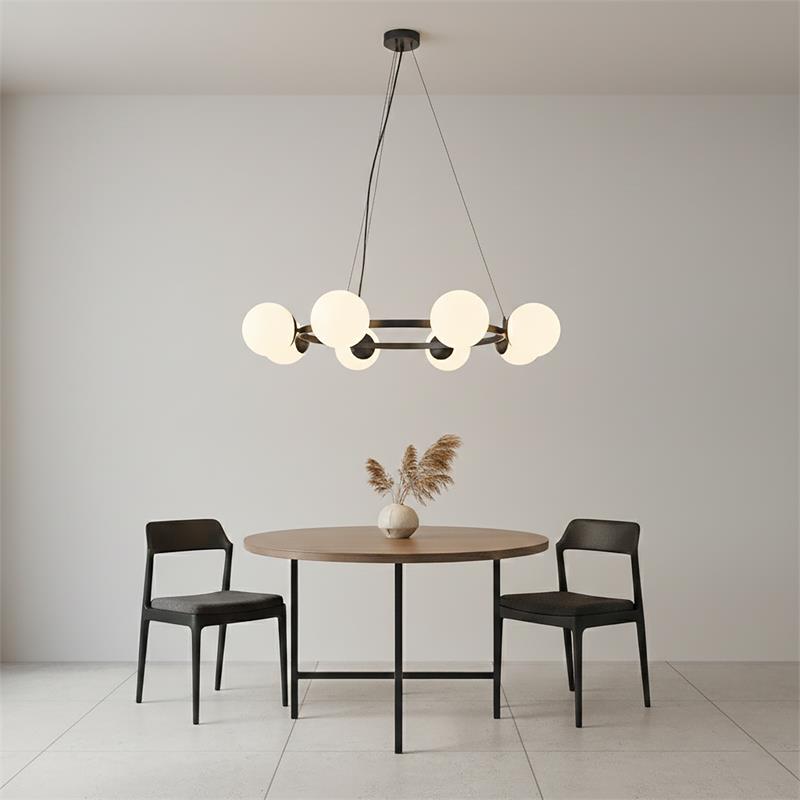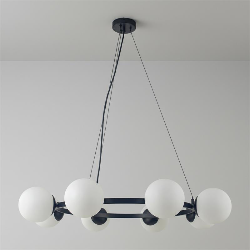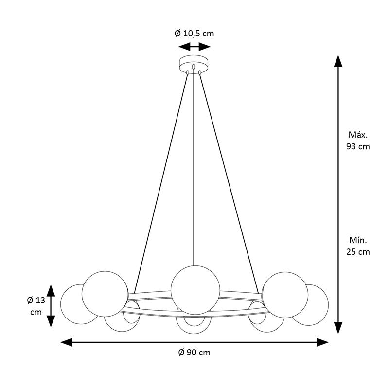 Serie GENOVEVA. Fabricado en metal en color negro ,vidrio blanco ,cable pvc transparente. Para su funcionamiento requiere 8 bombilla con casquillo E14. (bombillas no incluidas en la caja) .Apta para bombillas de tecnología Led cuya potencia máxima admitida por casquillo es de 15W. Con unas dimensiones de 90cm ancho por 90cm de profundo y 93cm de alto (regulable en altura de 25cm mínimo y 93cm máximo) y un peso real aproximado de 3150 gramos.Muy fácil de limpiar con una gamuza humedecida en agua y jabón neutro, te recomendamos que evites el uso de productos químicos que puedan dañarla.