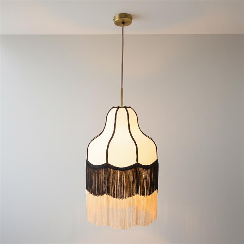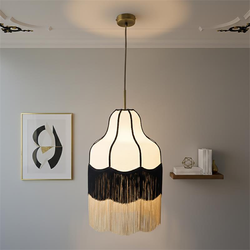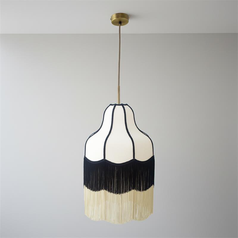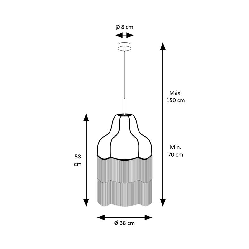 Serie LIV II. Fabricado en tejido en color negro ,textil beige ,cable yute oro. Para su funcionamiento requiere 1 bombilla con casquillo E27. (bombillas no incluidas en la caja) .Apta para bombillas de tecnología Led cuya potencia máxima admitida por casquillo es de 15W. Con unas dimensiones de 38cm ancho por 38cm de profundo y 150cm de alto (regulable en altura de 70cm mínimo y 150cm máximo) y un peso real aproximado de 600 gramos.Muy fácil de limpiar con una gamuza humedecida en agua y jabón neutro, te recomendamos que evites el uso de productos químicos que puedan dañarla.