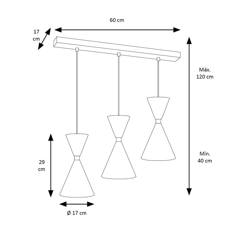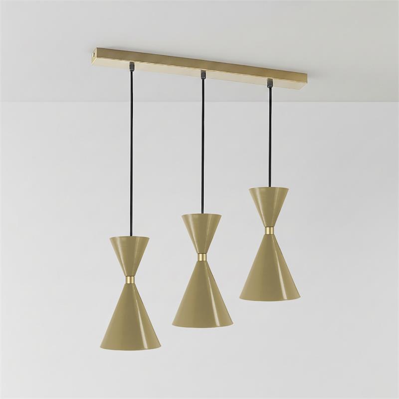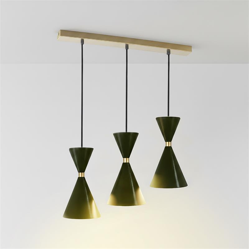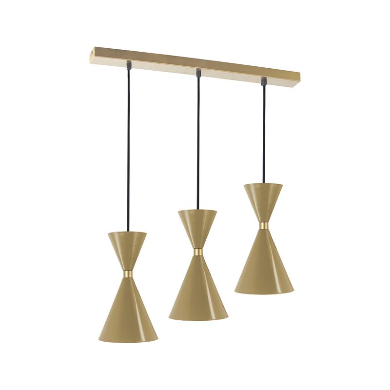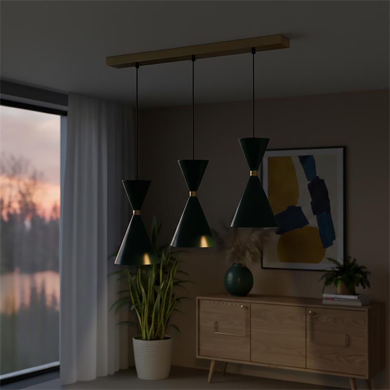 Serie XENA. Fabricado en metal en color verde ,metal oro ,cable textil negro. Para su funcionamiento requiere 3 bombilla con casquillo G9. (bombillas no incluidas en la caja) .Apta para bombillas de tecnología Led cuya potencia máxima admitida por casquillo es de 9W. Con unas dimensiones de 60cm ancho por 17cm de profundo y 120cm de alto (regulable en altura de 40cm mínimo y 120cm máximo) y un peso real aproximado de 1650 gramos.Muy fácil de limpiar con una gamuza humedecida en agua y jabón neutro, te recomendamos que evites el uso de productos químicos que puedan dañarla.
