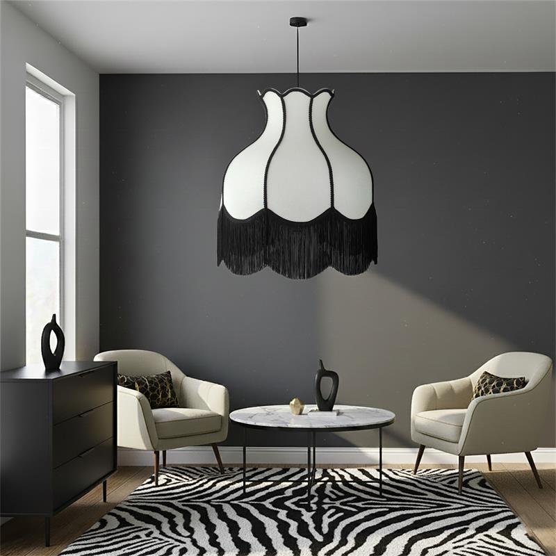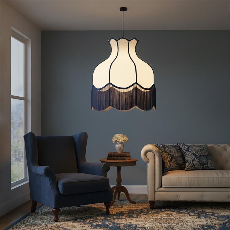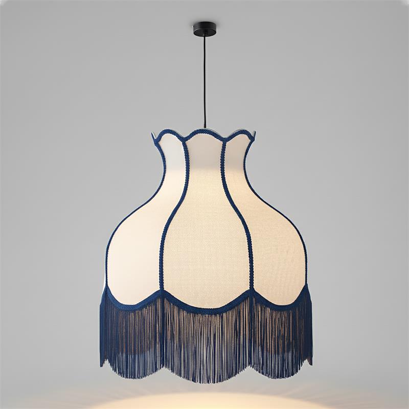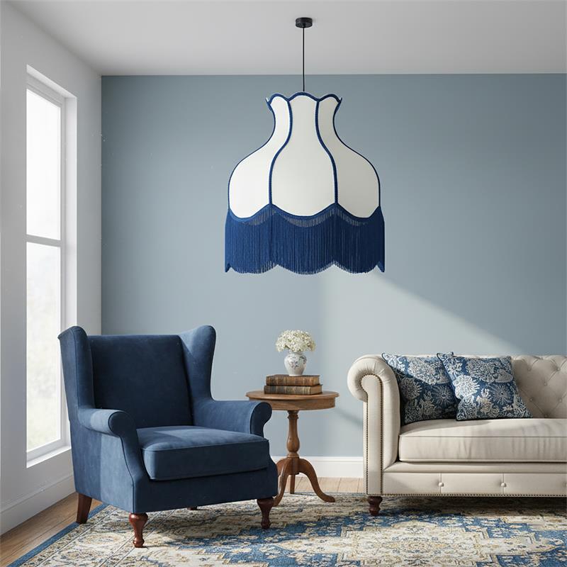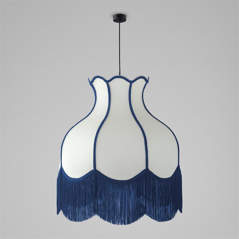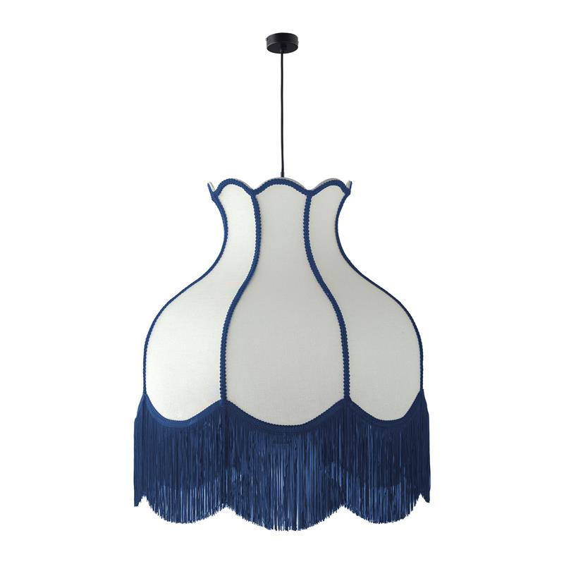 Serie SANCHICA. Fabricado en tejido en color azul ,textil blanco ,cable textil negro. Para su funcionamiento requiere 1 bombilla con casquillo E27. (bombillas no incluidas en la caja) .Apta para bombillas de tecnología Led cuya potencia máxima admitida por casquillo es de 15W. Con unas dimensiones de 70cm ancho por 70cm de profundo y 268cm de alto (regulable en altura de 80cm mínimo y 268cm máximo) y un peso real aproximado de 2000 gramos.Muy fácil de limpiar con una gamuza humedecida en agua y jabón neutro, te recomendamos que evites el uso de productos químicos que puedan dañarla.