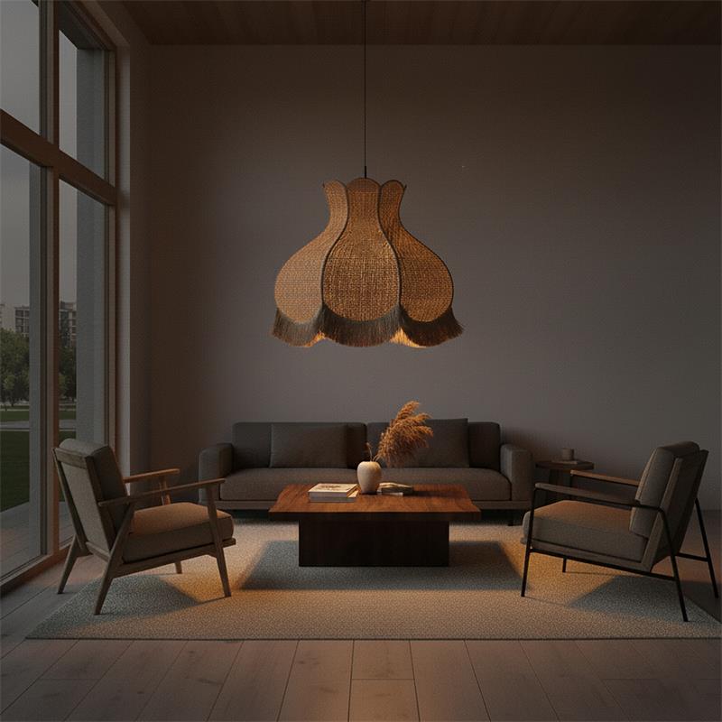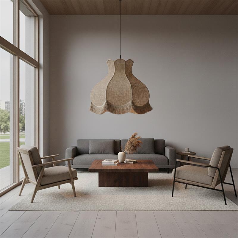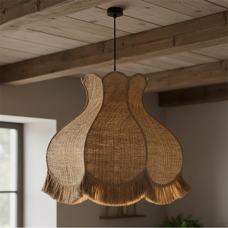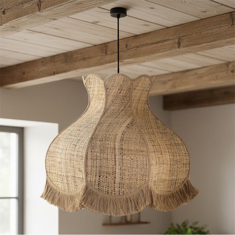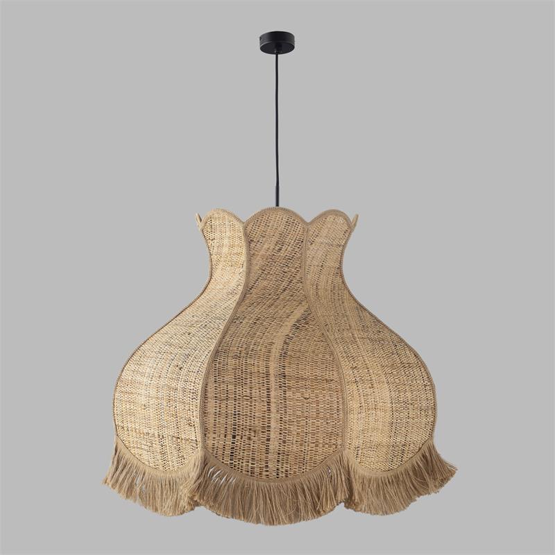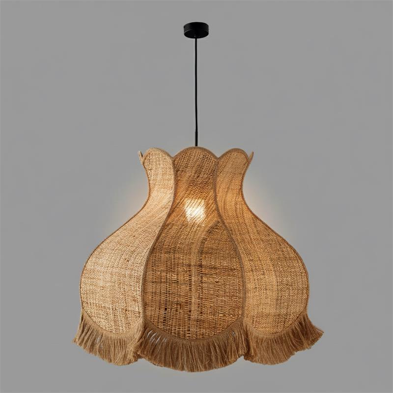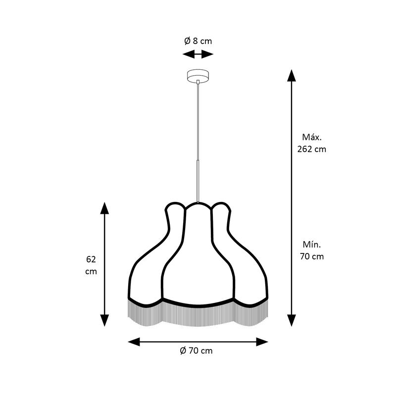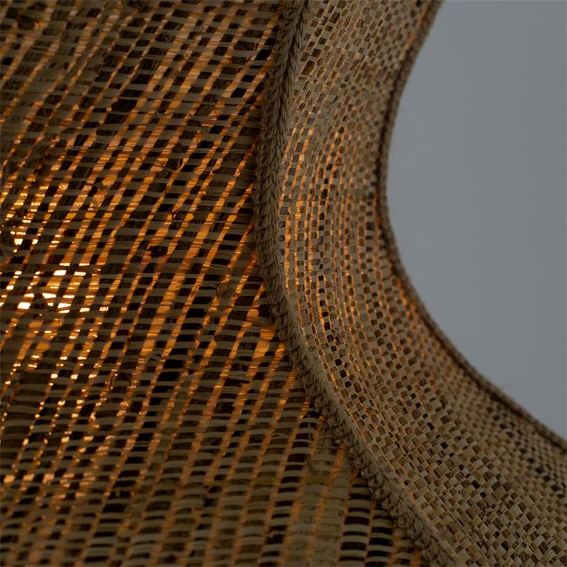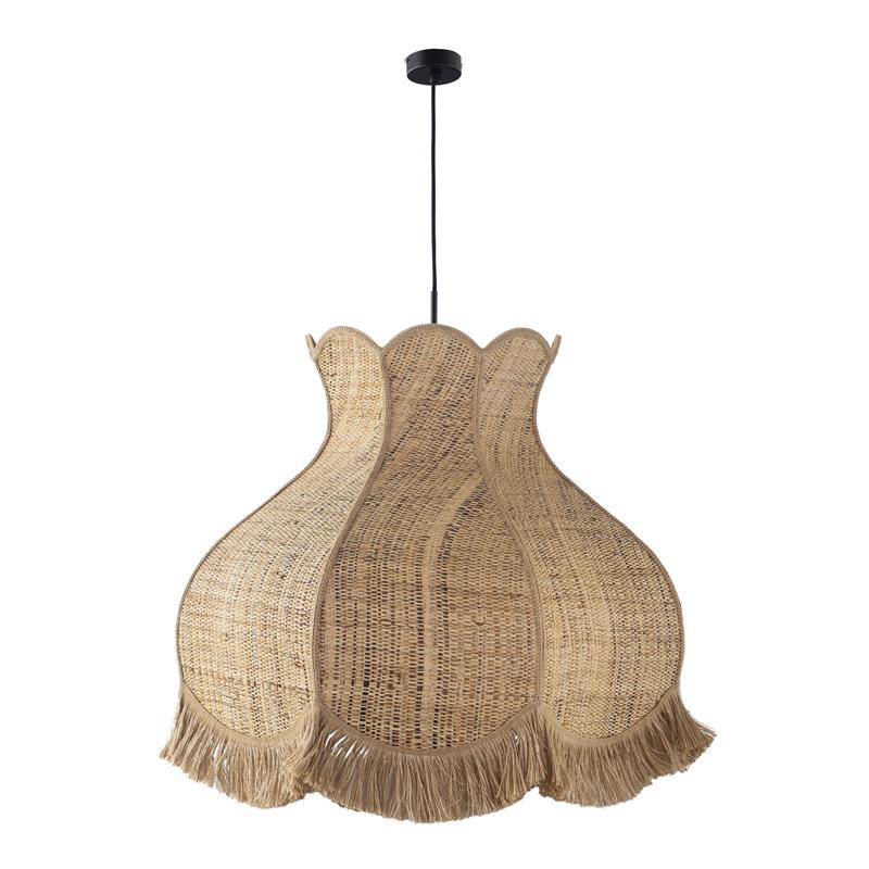 Serie TOLOSA. Fabricado en rafia en color natural ,yute natural ,cable textil negro. Para su funcionamiento requiere 1 bombilla con casquillo E27. (bombillas no incluidas en la caja) .Apta para bombillas de tecnología Led cuya potencia máxima admitida por casquillo es de 15W. Con unas dimensiones de 70cm ancho por 70cm de profundo y 56cm de alto (regulable en altura de 70cm mínimo y 262cm máximo) y un peso real aproximado de 2000 gramos.Muy fácil de limpiar con una gamuza humedecida en agua y jabón neutro, te recomendamos que evites el uso de productos químicos que puedan dañarla.