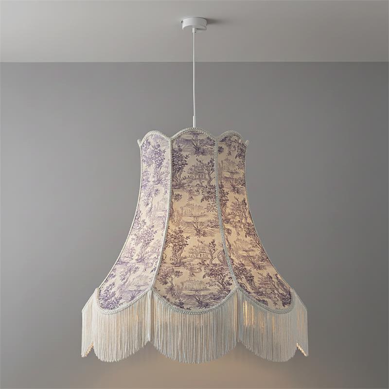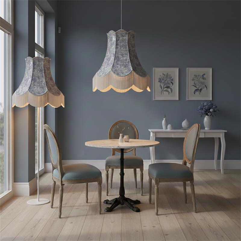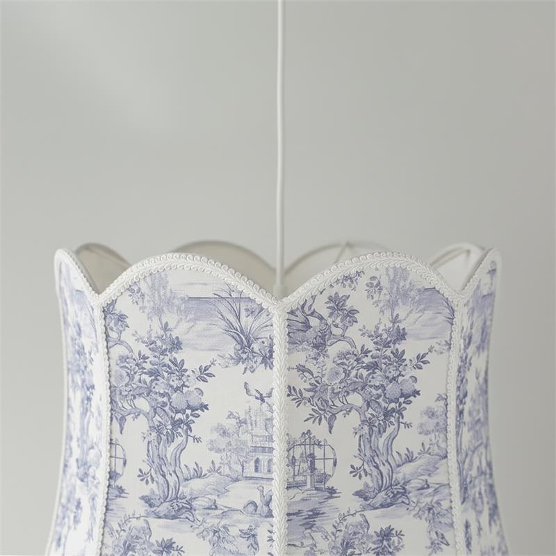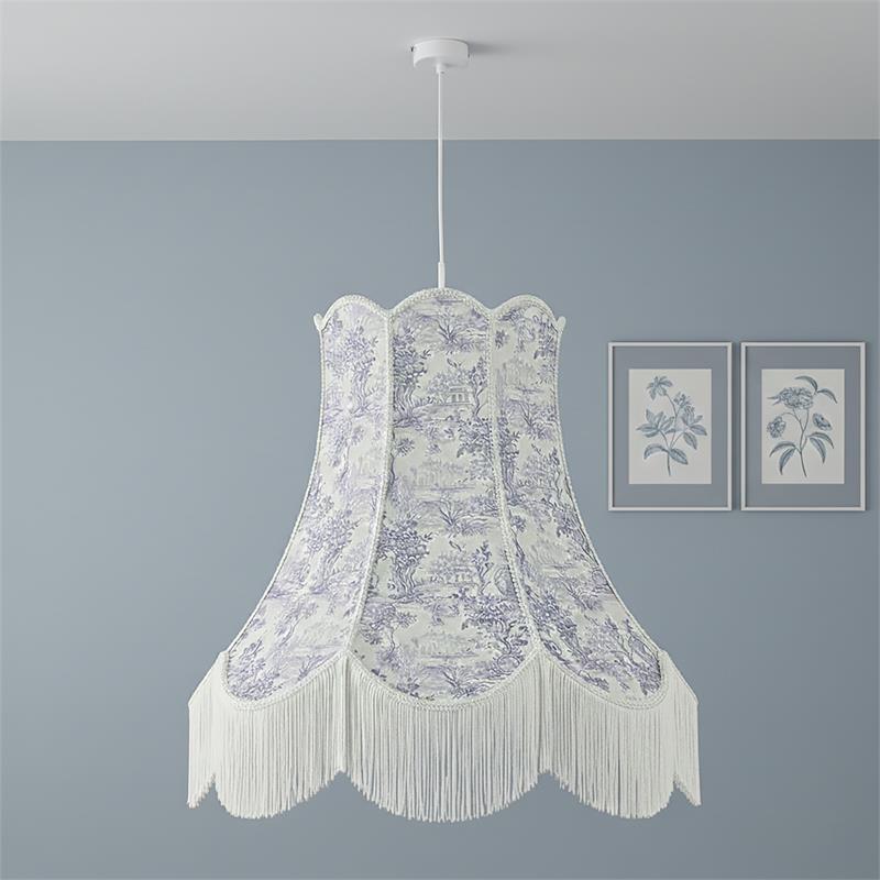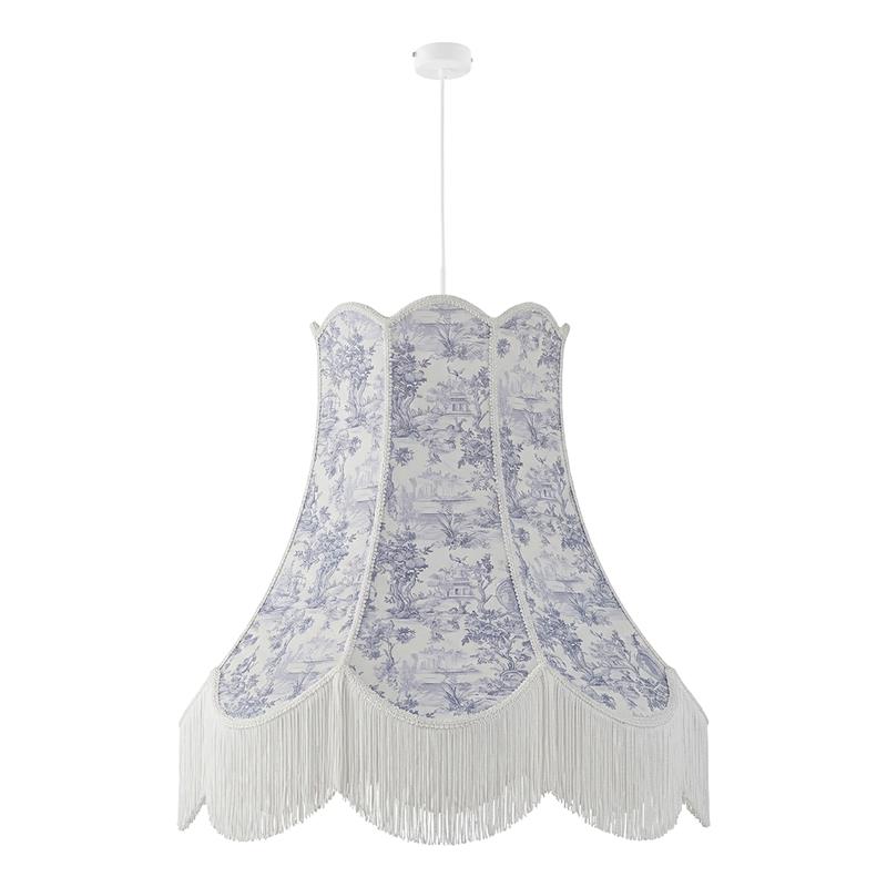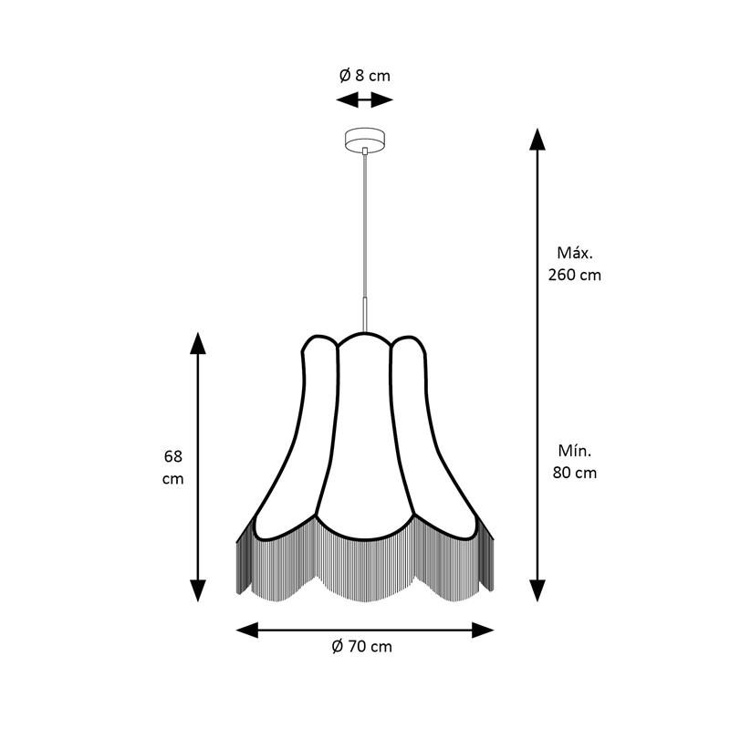Serie TRIFALDI. Fabricado en tejido en color azul ,textil blanco ,cable textil blanco. Para su funcionamiento requiere 1 bombilla con casquillo E27. (bombillas no incluidas en la caja) .Apta para bombillas de tecnología Led cuya potencia máxima admitida por casquillo es de 15W. Con unas dimensiones de 70cm ancho por 70cm de profundo y 260cm de alto (regulable en altura de 80cm mínimo y 260cm máximo) y un peso real aproximado de 1800 gramos.Muy fácil de limpiar con una gamuza humedecida en agua y jabón neutro, te recomendamos que evites el uso de productos químicos que puedan dañarla.