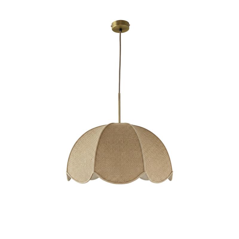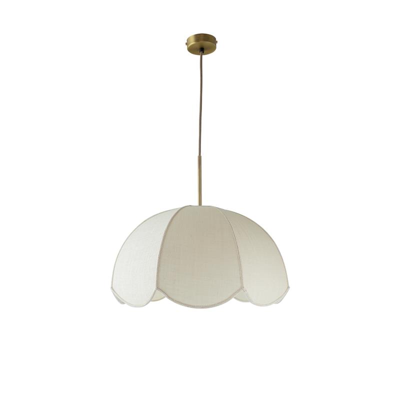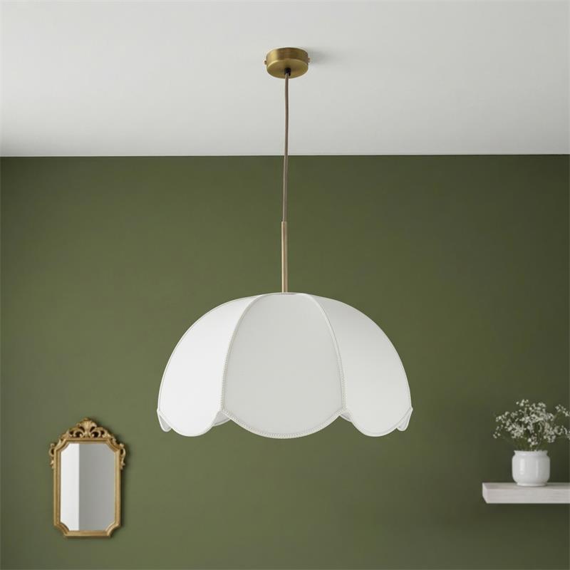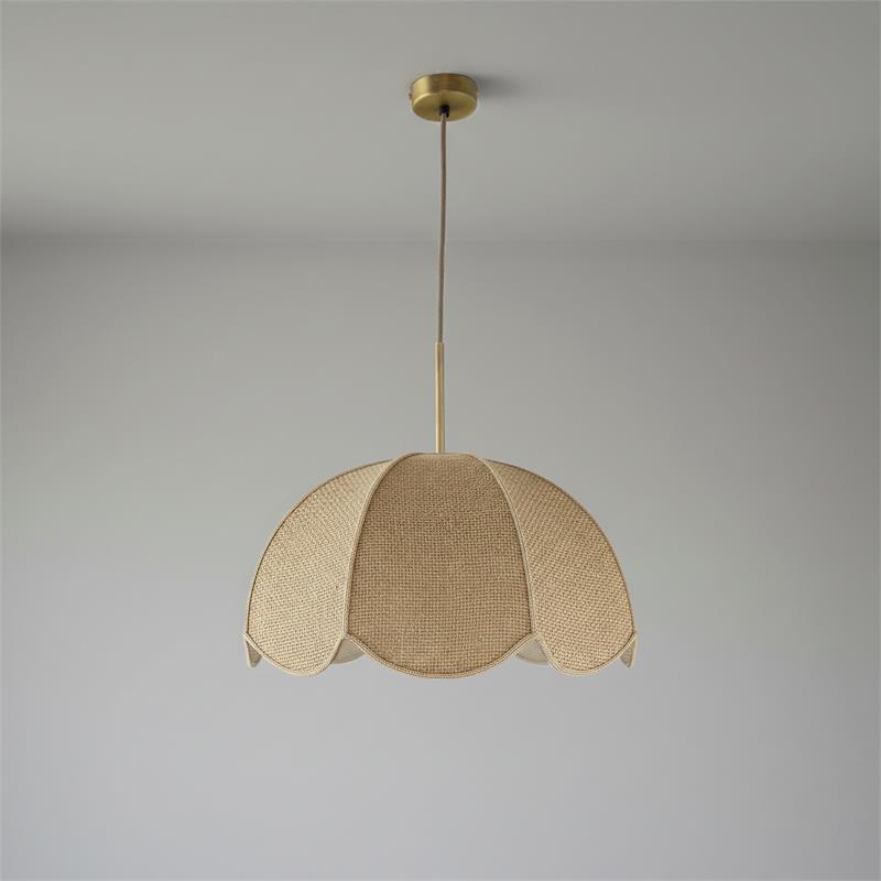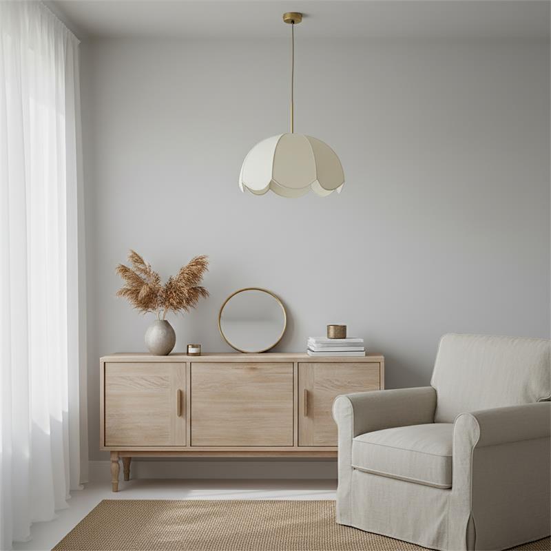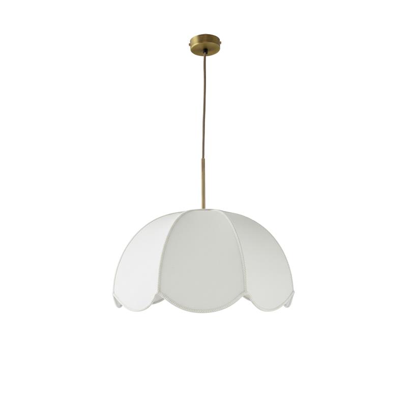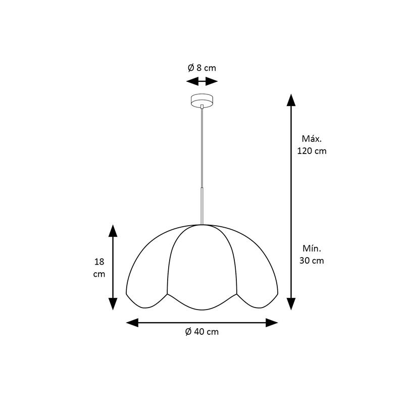 Serie VALENTINA. Fabricado en tejido en color blanco ,metal oro ,cable yute natural. Para su funcionamiento requiere 1 bombilla con casquillo E27. (bombillas no incluidas en la caja) .Apta para bombillas de tecnología Led cuya potencia máxima admitida por casquillo es de 15W. Con unas dimensiones de 40cm ancho por 40cm de profundo y 120cm de alto (regulable en altura de 30cm mínimo y 120cm máximo) y un peso real aproximado de 650 gramos.Muy fácil de limpiar con una gamuza humedecida en agua y jabón neutro, te recomendamos que evites el uso de productos químicos que puedan dañarla.
